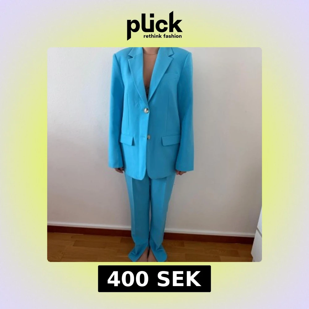 Snygg turkos kostym med klassisk kavaj och matchande raka kostymbyxor. Kavajen har två knappar framtill, breda slag och fickor med lock. Byxorna är höga i midjan och har en stilren, rak passform. Perfekt för dig som vill sticka ut med färg.