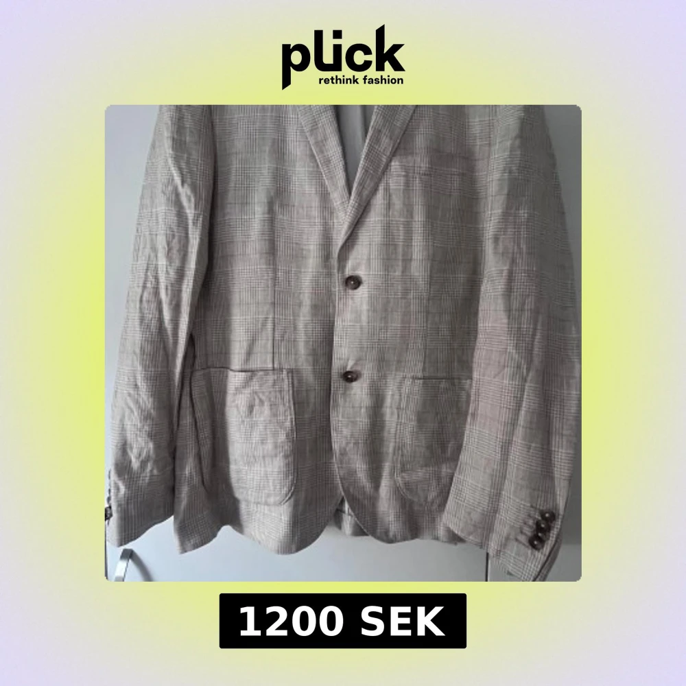 Snygg beige kavaj i Slim Fit med rutigt mönster och klassiska knappar på ärmslutet. Tillverkad i ett lätt och luftigt rent linne tyg, perfekt för dig som gillar stilrena och moderna plagg. Kavajen har två framfickor och en slits bak för extra rörelsefrihet.Str 52 och i mycket bra skick.