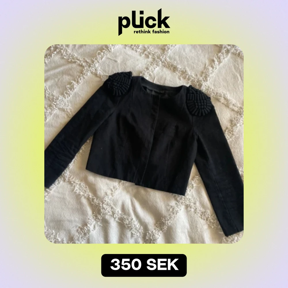 Helt otrolig bolero jacka med fräsiga axlar och tryckknapp Storlek S (36) Längd 45cm Bredd 38cm Ärmlängd 52cm Ngt slags lite grövre canvastyg och troligtvis polyester foder. Tre stycken tryckknappar. Spår efter att det funnits fler men dem är bort