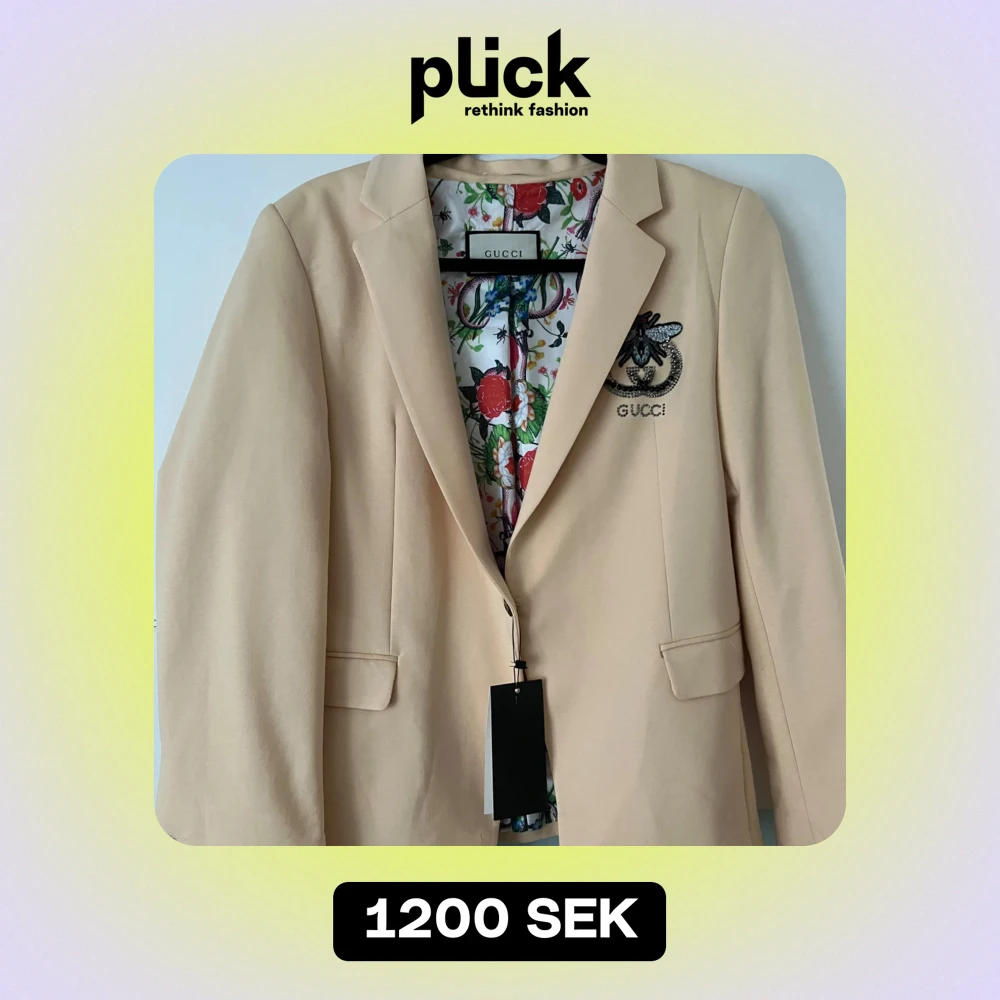 Säljer en snygg beige kavaj från Gucci i nytt skick. Den har ett coolt broderat bi-motiv på ryggen och ett färgglatt blommigt foder. Kavajen har en klassisk passform med två fickor fram och en knapp för stängning. Perfekt för både fest och vardag!