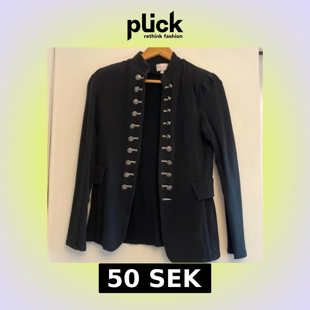Snygg svart rock från Chica London med coola silvriga knappar i två rader framtill och ståkrage. Jackan har långa ärmar, fickdetaljer och en rak passform. Perfekt för dig som vill sticka ut med en militärinspirerad look.