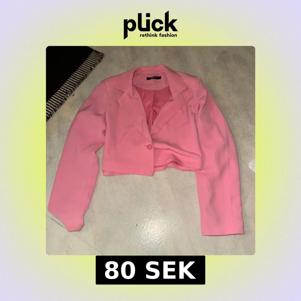 Snygg rosa kavaj med en enkel knapp framtill. Den är croppad och har långa ärmar, perfekt för en trendig look. Passar S-l beroende på hur man vill att den ska sitta.