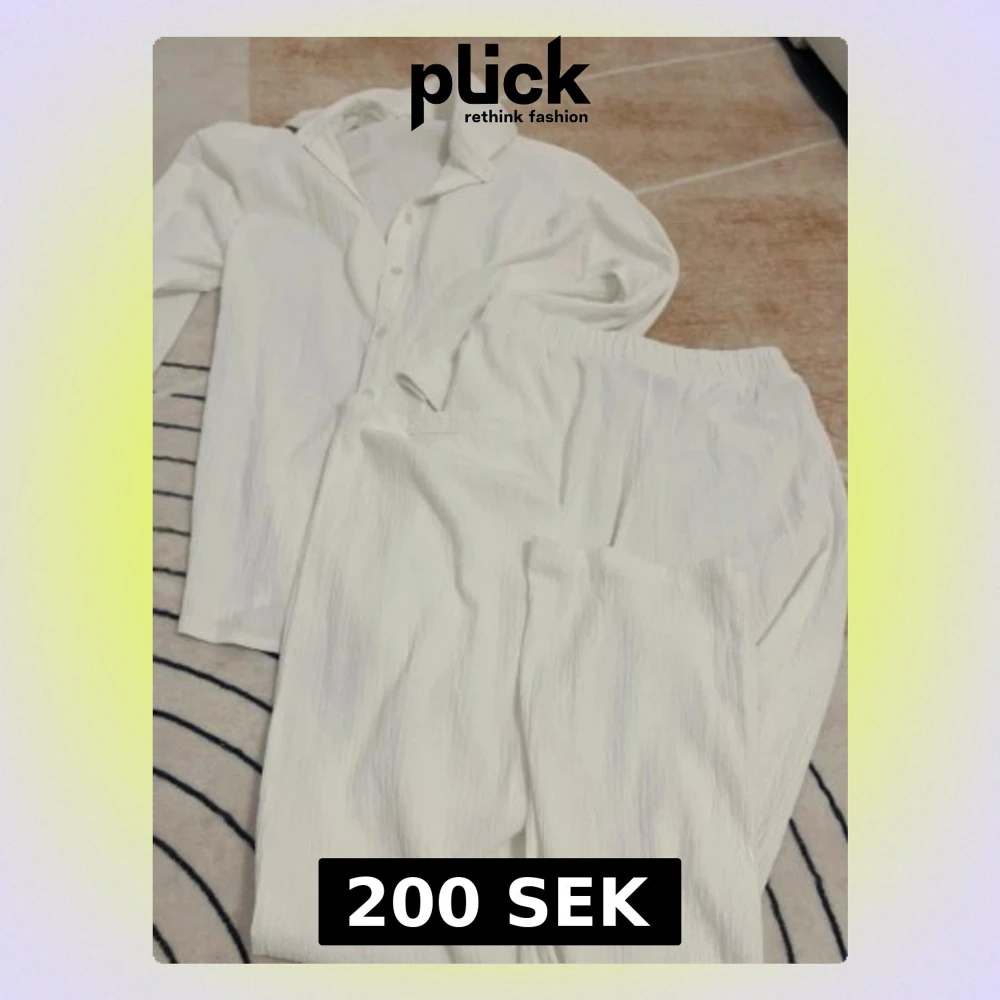 Säljer en stilren vit tvådelad skjorta och byxa. Skjortan har klassisk krage och knappar framtill, medan byxan har resår i midjan för skön passform. Materialet är lätt och har en diskret struktur som ger en modern känsla.