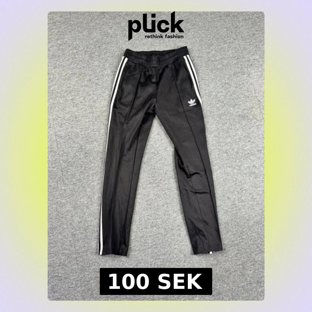 Säljer ett par klassiska svarta mjukisbyxor från Adidas med vita ränder längs sidorna och Adidas-logga på vänster ben. Byxorna har resår i midjan och dragkedjefickor. Perfekta för chill eller träning, tillverkade i ett mjukt och följsamt material.