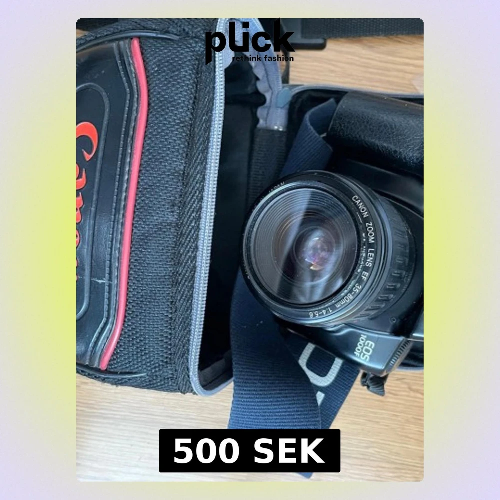 Säljer en svart Canon EOS 1000F systemkamera med tillhörande zoomobjektiv 35-80mm f/4-5.6 och originalväska. Kameran har klassisk design i plast och metall, och medföljer gör även en axelrem med Canon-logga. Perfekt för dig som vill börja med analog foto.