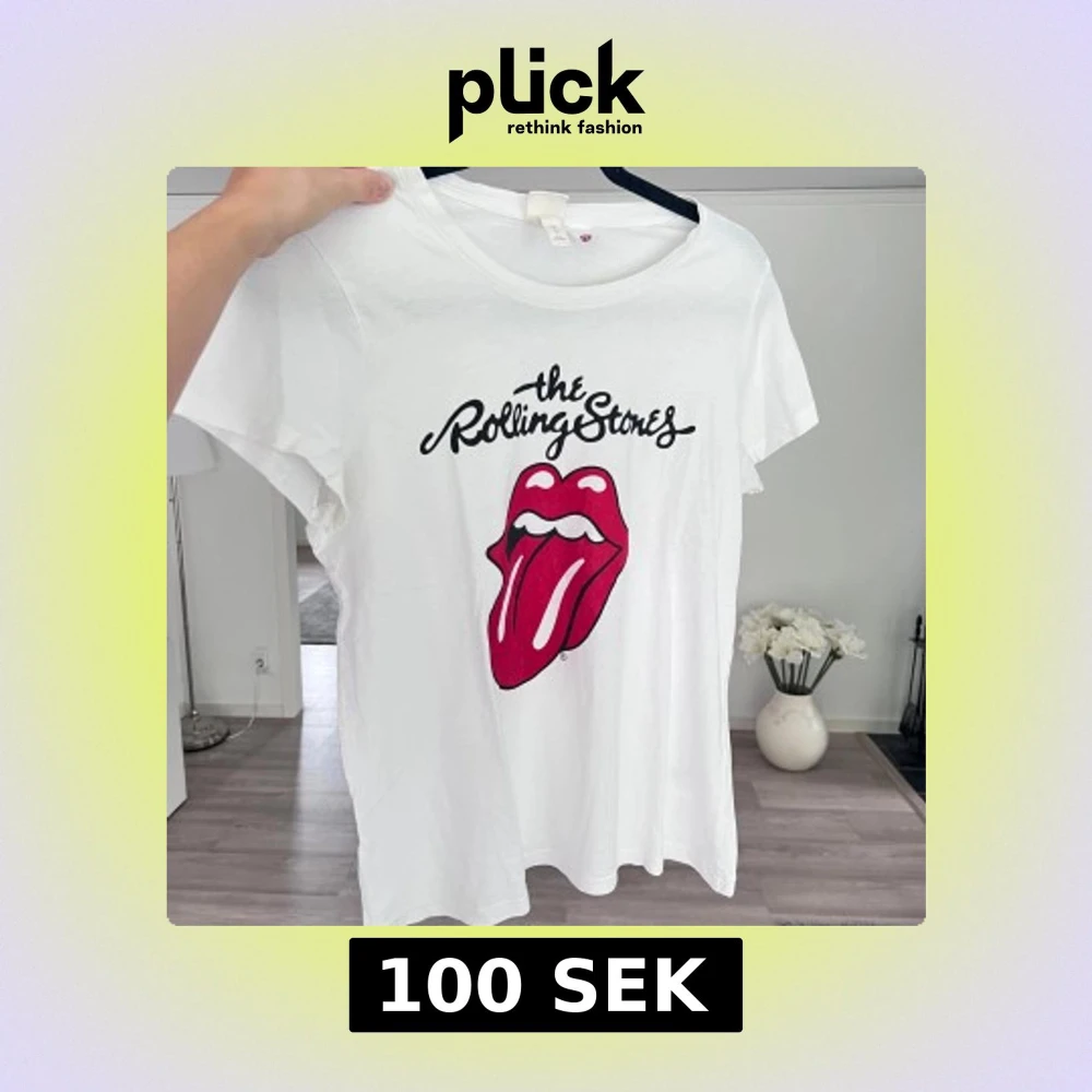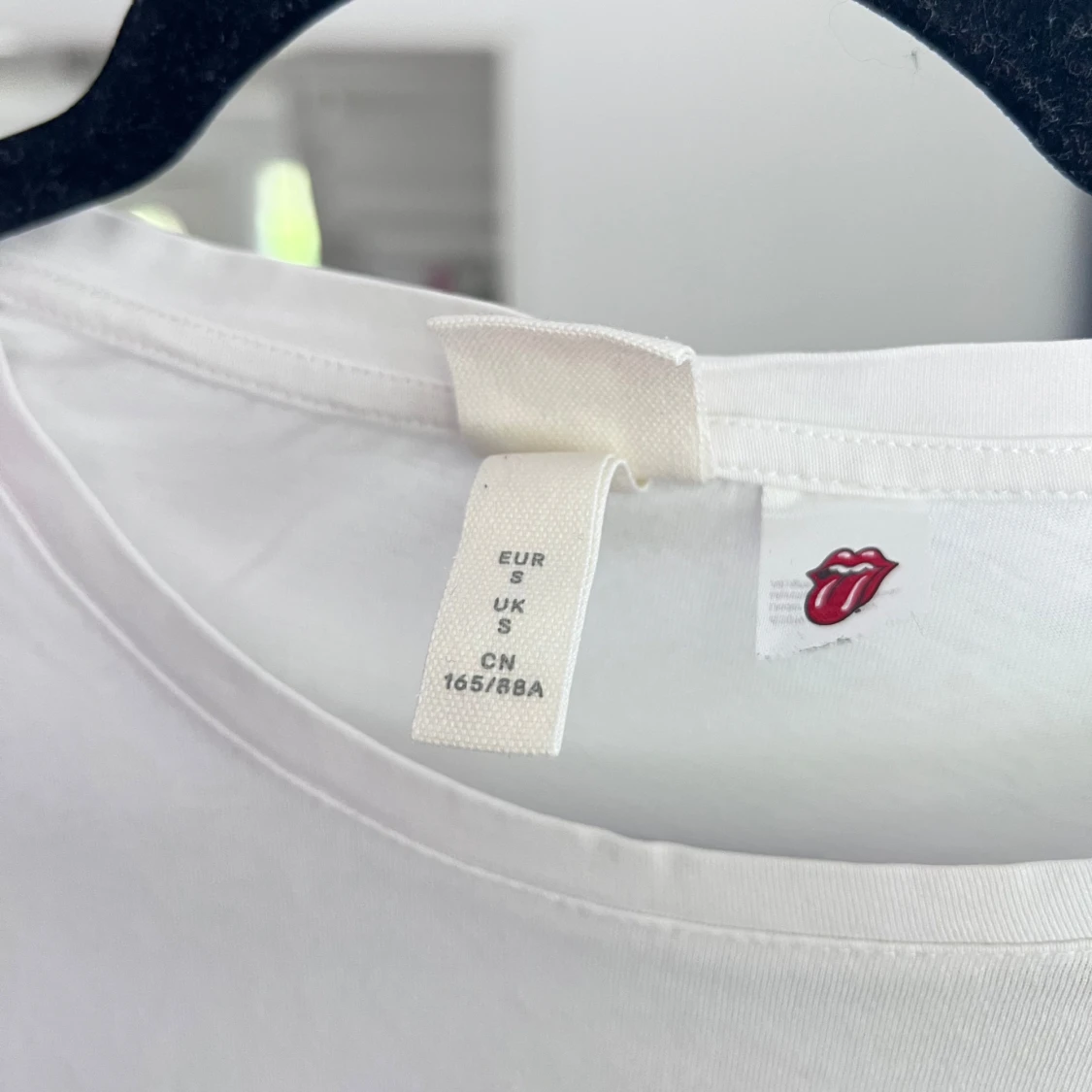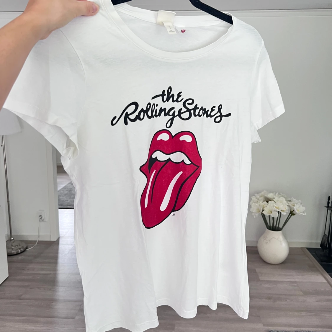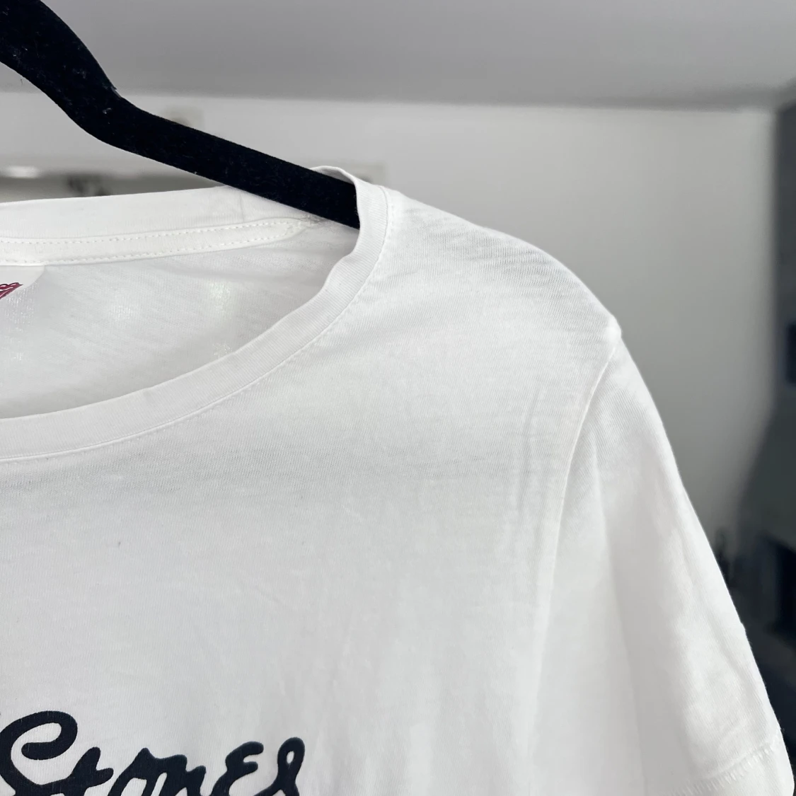 Vit t-shirt med klassiskt Rolling Stones-tryck framtill. T-shirten har rund hals, korta ärmar och är gjord i mjuk bomull. Perfekt för dig som gillar bandmerch. Önskar du veta exakta mått? Tveka inte att höra av dig! 🤍❤️