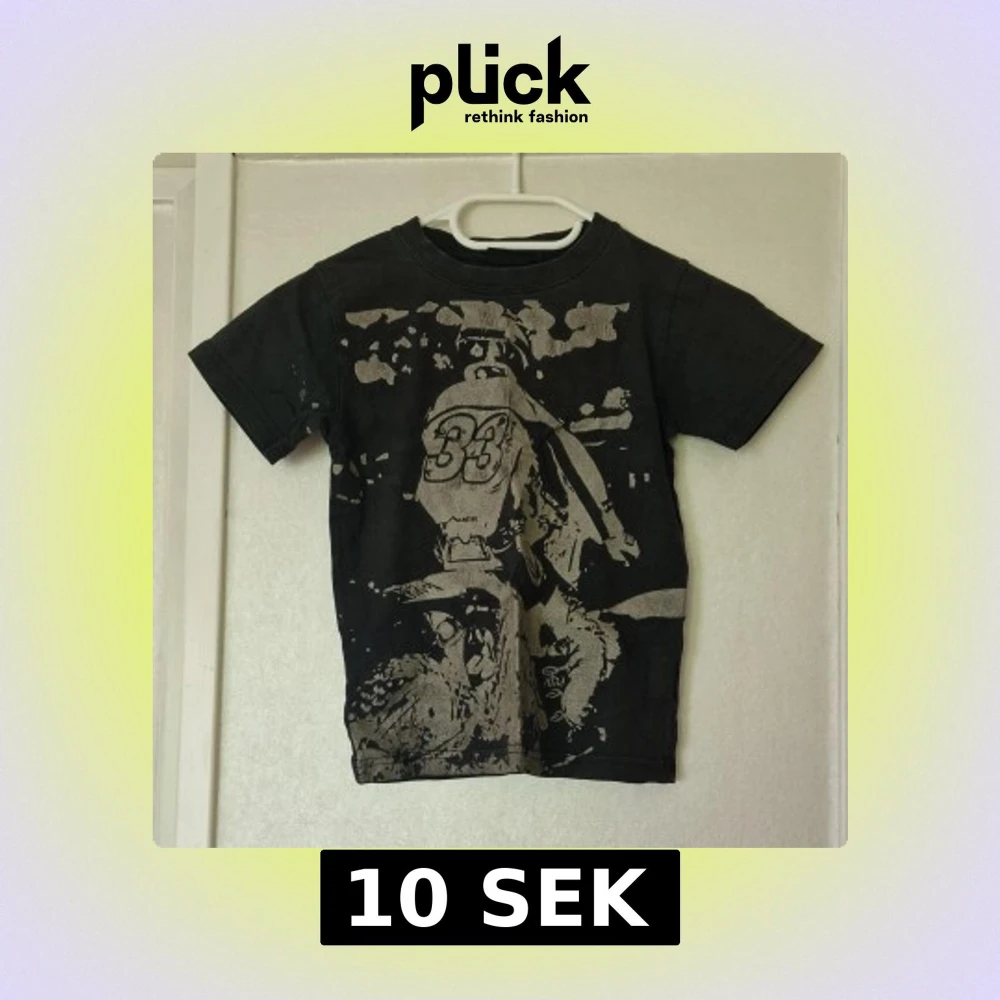Svart t-shirt med ett stort tryck av en motorcyklist och siffran 33 på framsidan. T-shirten har korta ärmar och en klassisk passform. Materialet känns som bomull och trycket ger en rå streetkänsla. Perfekt för dig som gillar motorsport eller vill ha en edgy look. Det är mycket sprickor i trycket.