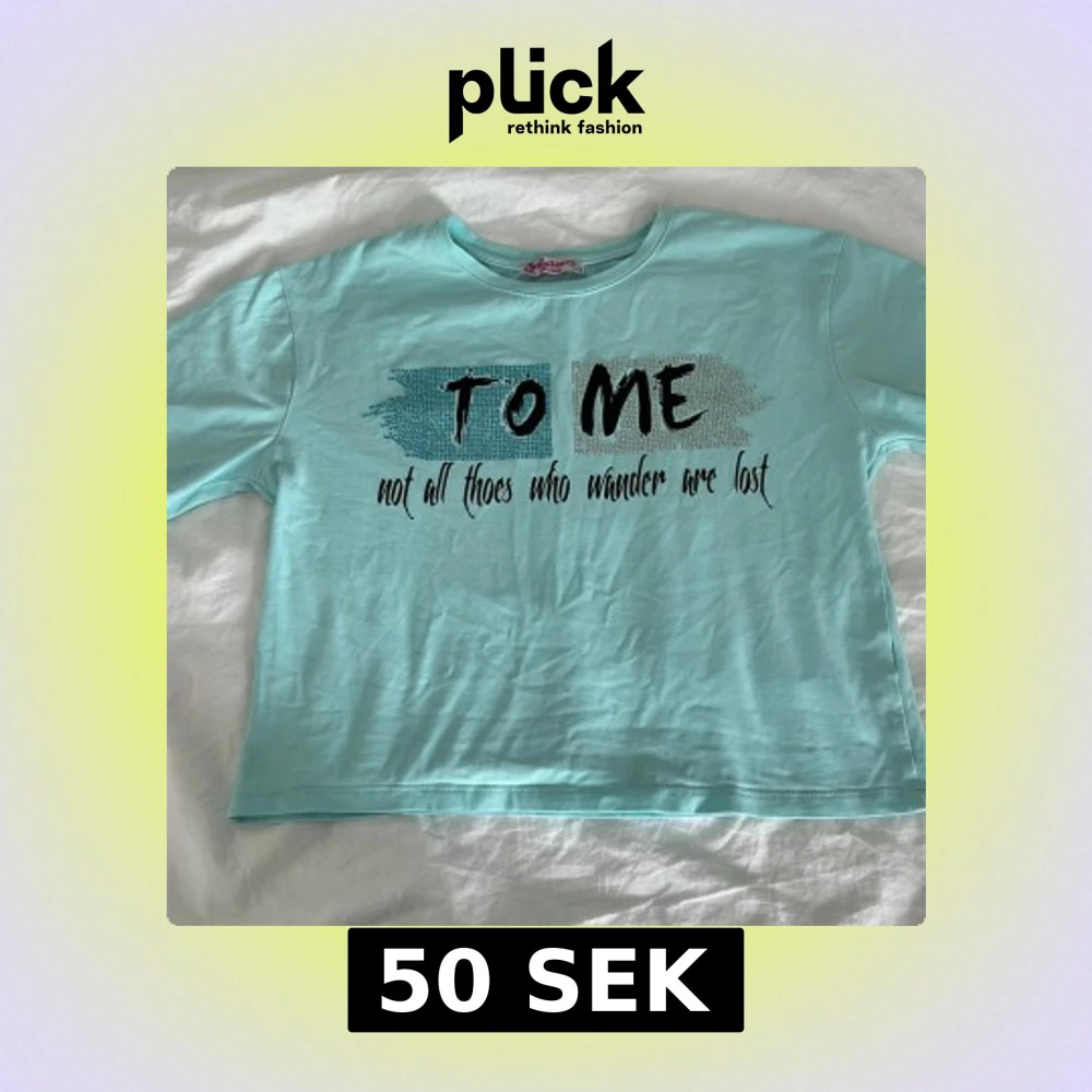 Turkos croppad t-shirt från Gjollen med svart texttryck 'To me not all thoes who wonder are lost' framtill. Klassisk rund halsringning och korta ärmar. Skön och lätt i bomull, perfekt för en chill stil.