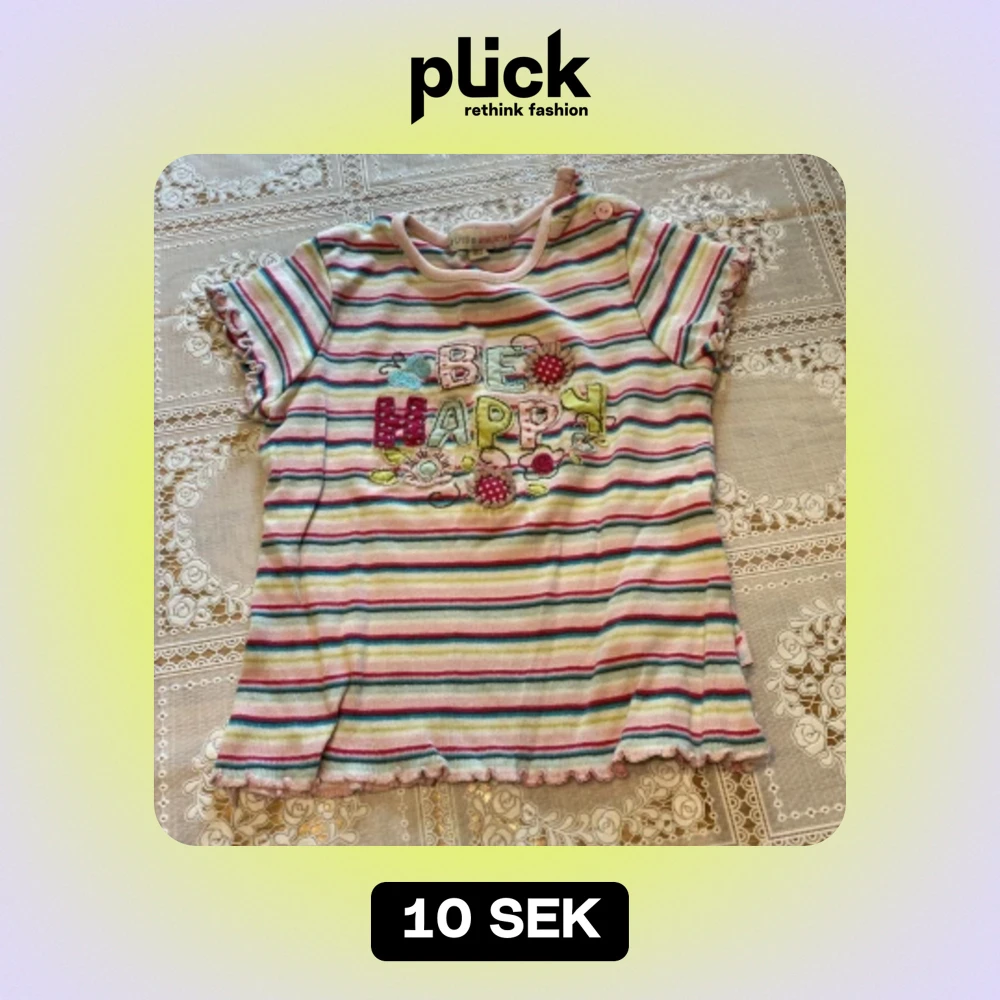 Randig tröja med motivet: BE HAPPY. Storlek 80 från ”Little GIRLSTAR”. Använd några gånger.
