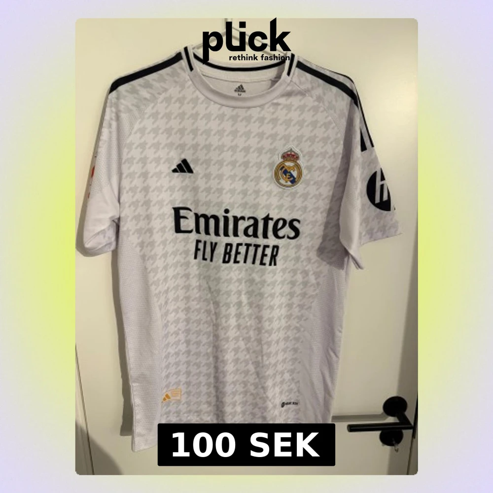 Säljer en vit Real Madrid matchtröja från Adidas med Mbappé och nummer 9 på ryggen. Tröjan har korta ärmar, svart tryck och coolt mönster över hela tyget. Officiella klubbmärket på bröstet och snygga svarta ränder på axlarna. Perfekt för fotbollsfans!