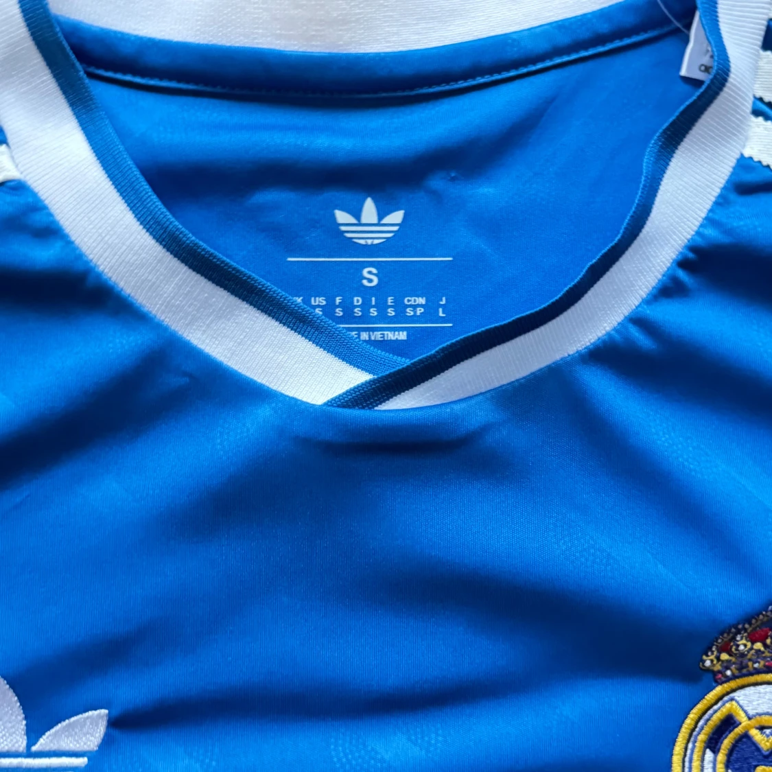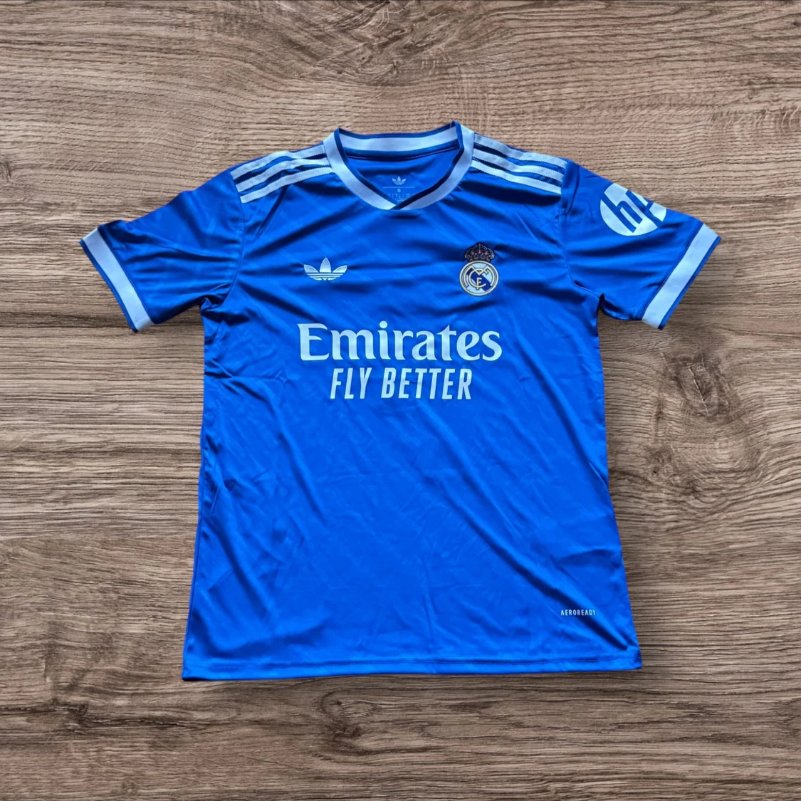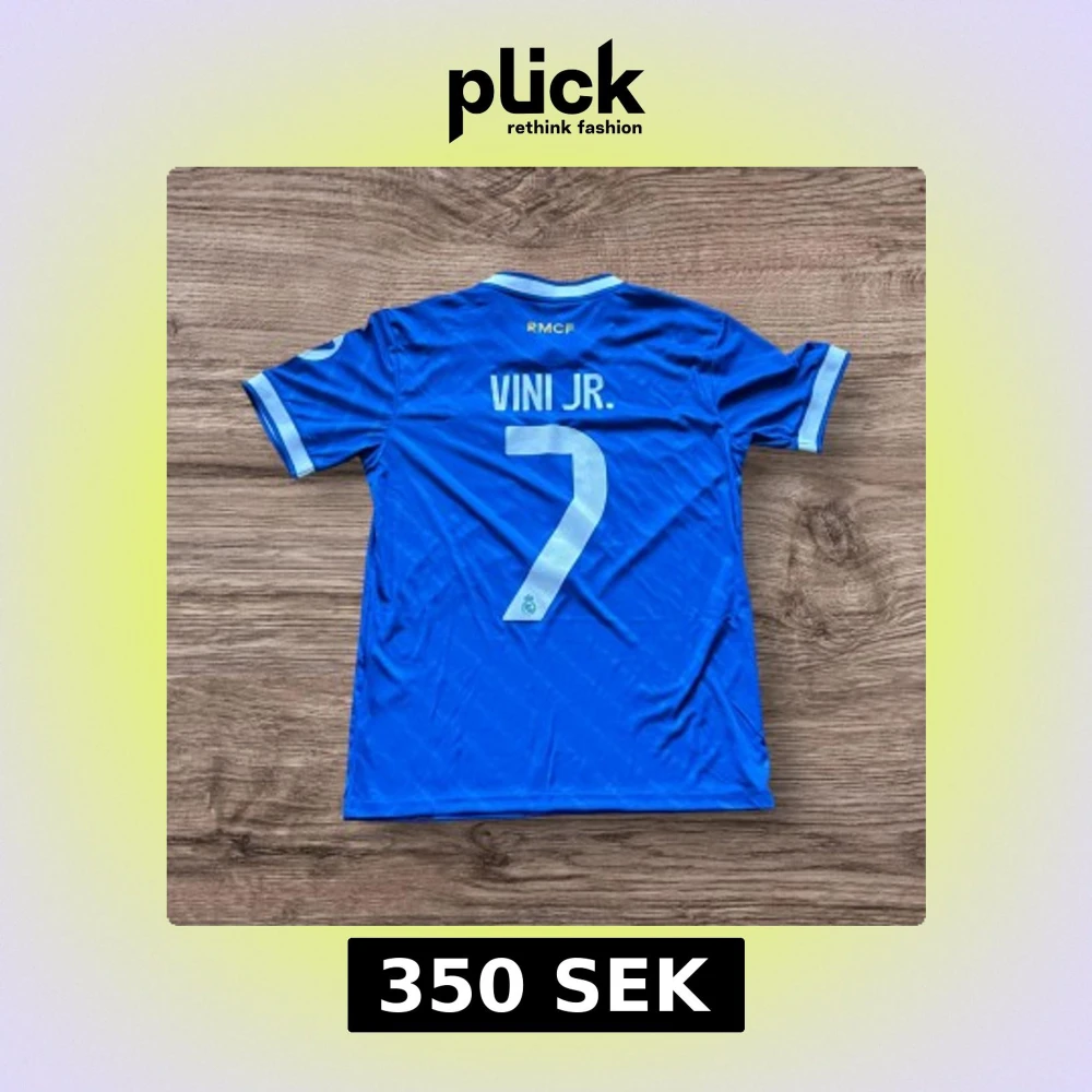 Blå Real Madrid fotbollströja med Vini Jr. och nummer 7 på ryggen. Adidas-logga och klubbmärke på bröstet, samt vita detaljer på krage och ärmslut. Kortärmad modell i lätt och ventilerande polyester, med tryckta sponsors och Aeroready-teknologi.