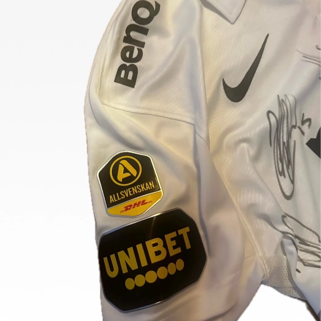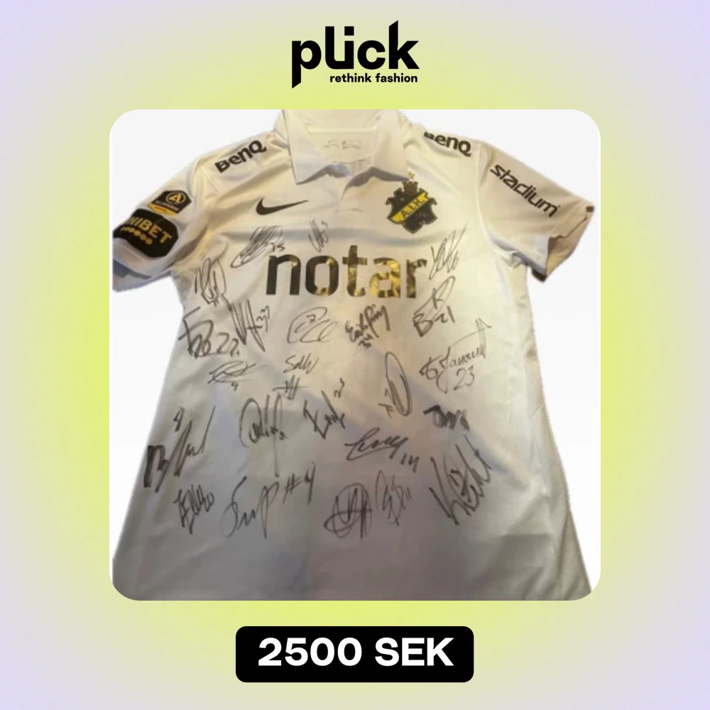 En AIK t-shirt signerad av spelare som Sebastian Larsson, goitom, stefanelli och andra bra spelare som spelade där 2018. Tröjan är i storlek M men kan också passa i storlek S.