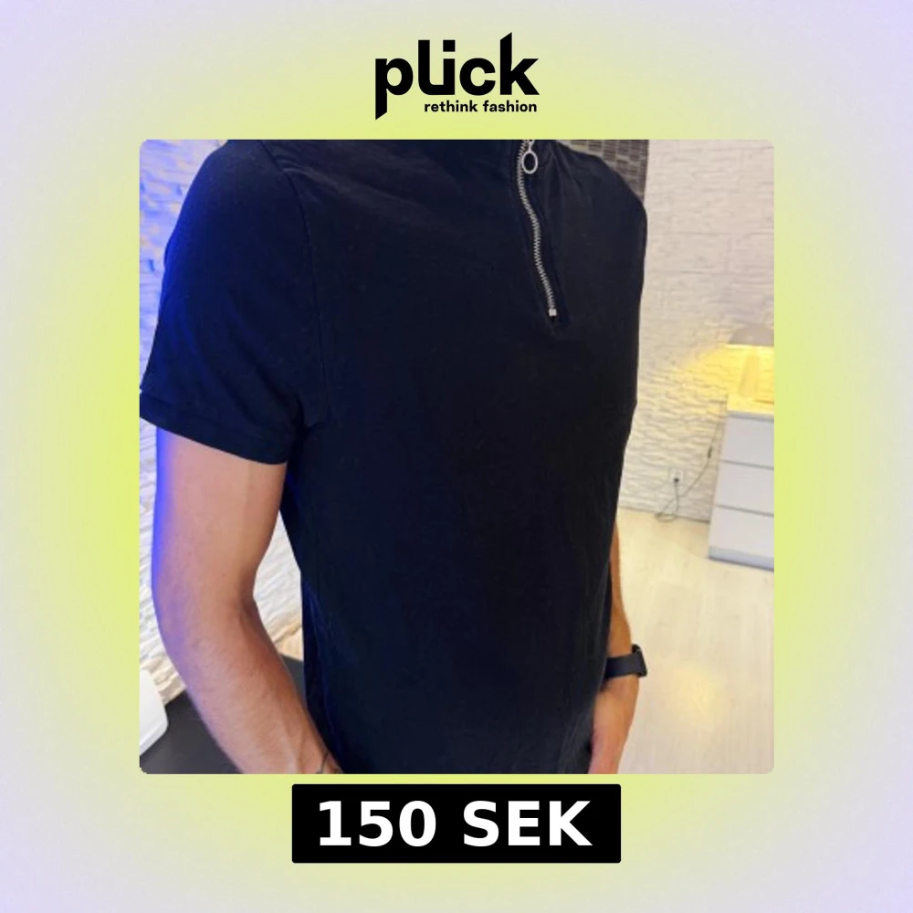 Svart t-shirt med korta ärmar och en cool ståkrage med silverfärgad dragkedja framtill. T-shirten har en clean look och är gjord i mjukt material, perfekt för en stilren och avslappnad vibe. Passar perfekt s/m storlek.