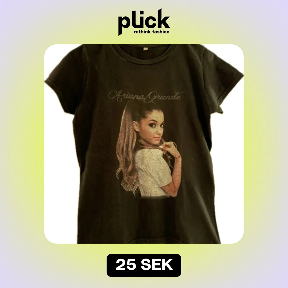 Säljer en svart t-shirt med tryck av Ariana Grande på framsidan. Perfekt för fans som vill visa sin kärlek till artisten. Barn/ungdom stl S 25kr🎤 Hämtas på Hägerstensåsen eller ök.