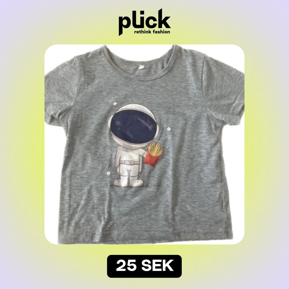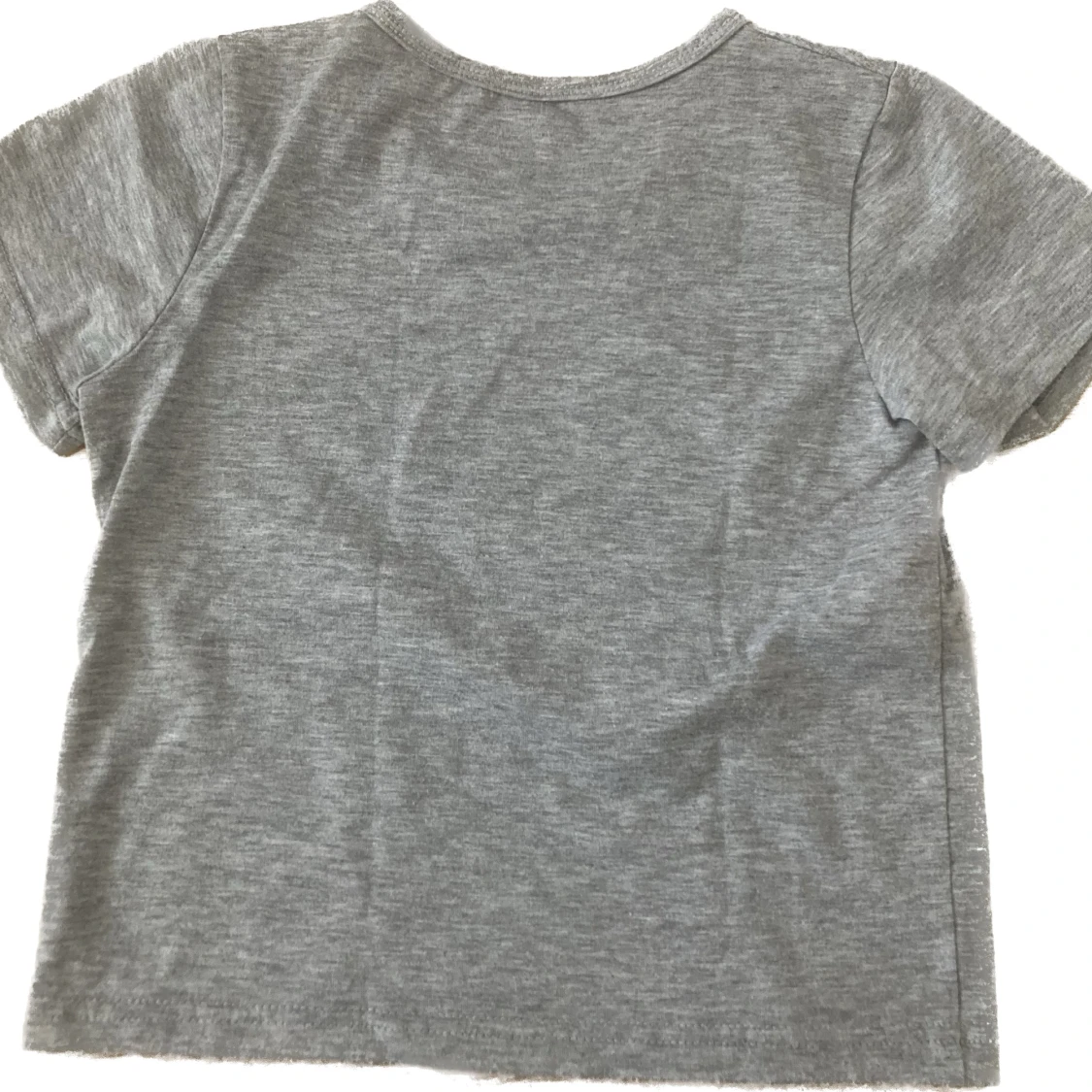 En grå t shirt i storlek 110 men sitter som en baby tee om man har storlek xs