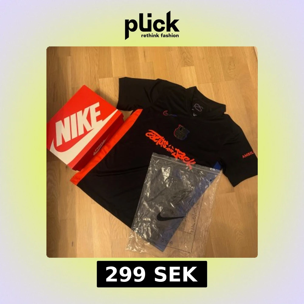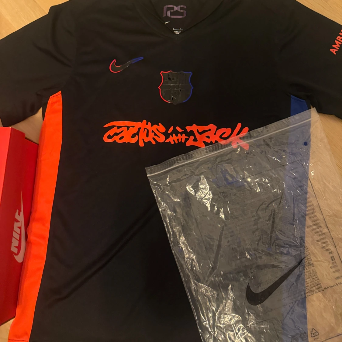 Säljer en svart FC Barcelona x Nike Cactus Jack fotbollströja med kort ärm. Tröjan har blå och röda detaljer, klubbmärke på bröstet och Cactus Jack-tryck i rött framtill. Materialet är lätt och andas, perfekt för match eller träning.