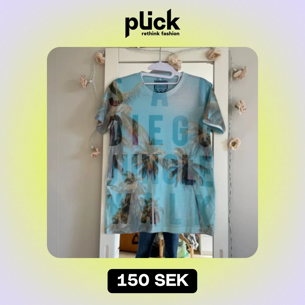 Säljer en supercool blå t-shirt från Name It med ett tropiskt palmtryck. Perfekt för sommardagar och ger en skön beach vibe. T-shirten är i storlek 158-164 och har korta ärmar. Den är i bra skick och redo för nya äventyr! .passar som en smal