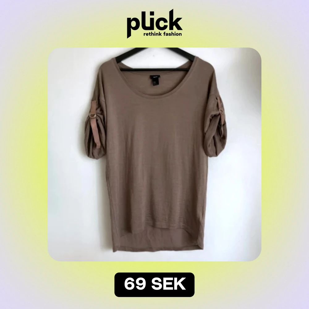 Brun stickad topp i ullblandning, upprullade ärmar med justerbara hällor, längre bak, lätt lyster, något nedhasad axel. Visst ytslitage finns. Mått i cm: bröstvidd 47; längd fram från axeln 67.
