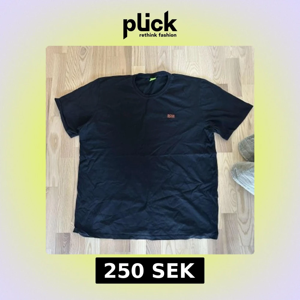 Säljer en svart t-shirt från BOSS med röd logga på bröstet. Den har en klassisk rund hals och korta ärmar. Perfekt för en stilren look.