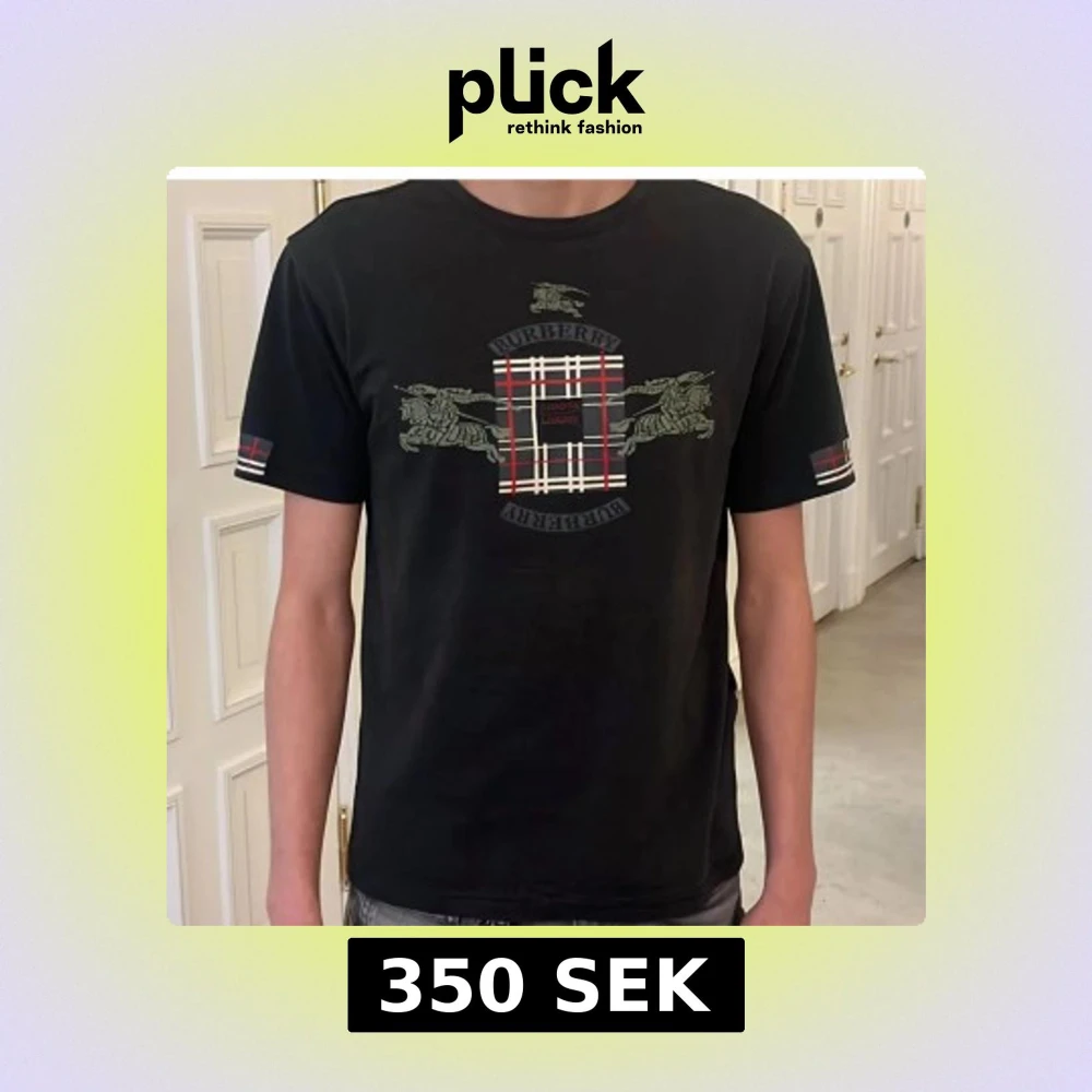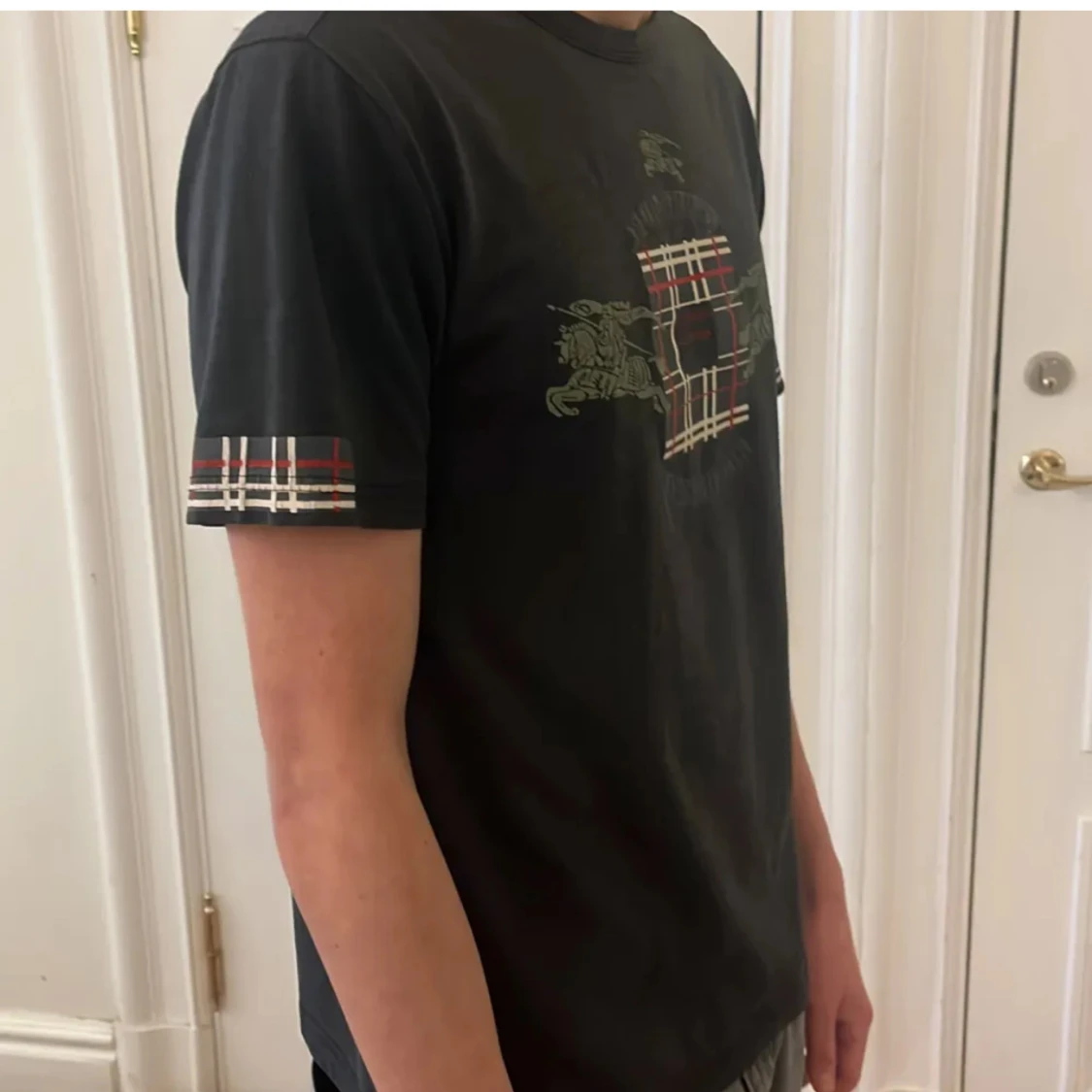 Svart t-shirt från Burberry med klassiskt rutig print i rött, vitt och grått på bröstet samt Burberry-ryttare tryckta fram och bak. Kortärmad modell i mjuk bomull, med rutiga detaljer även på ärmarna. Snygg och stilren med tydlig logga.