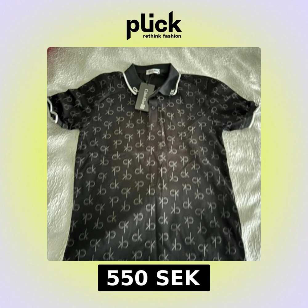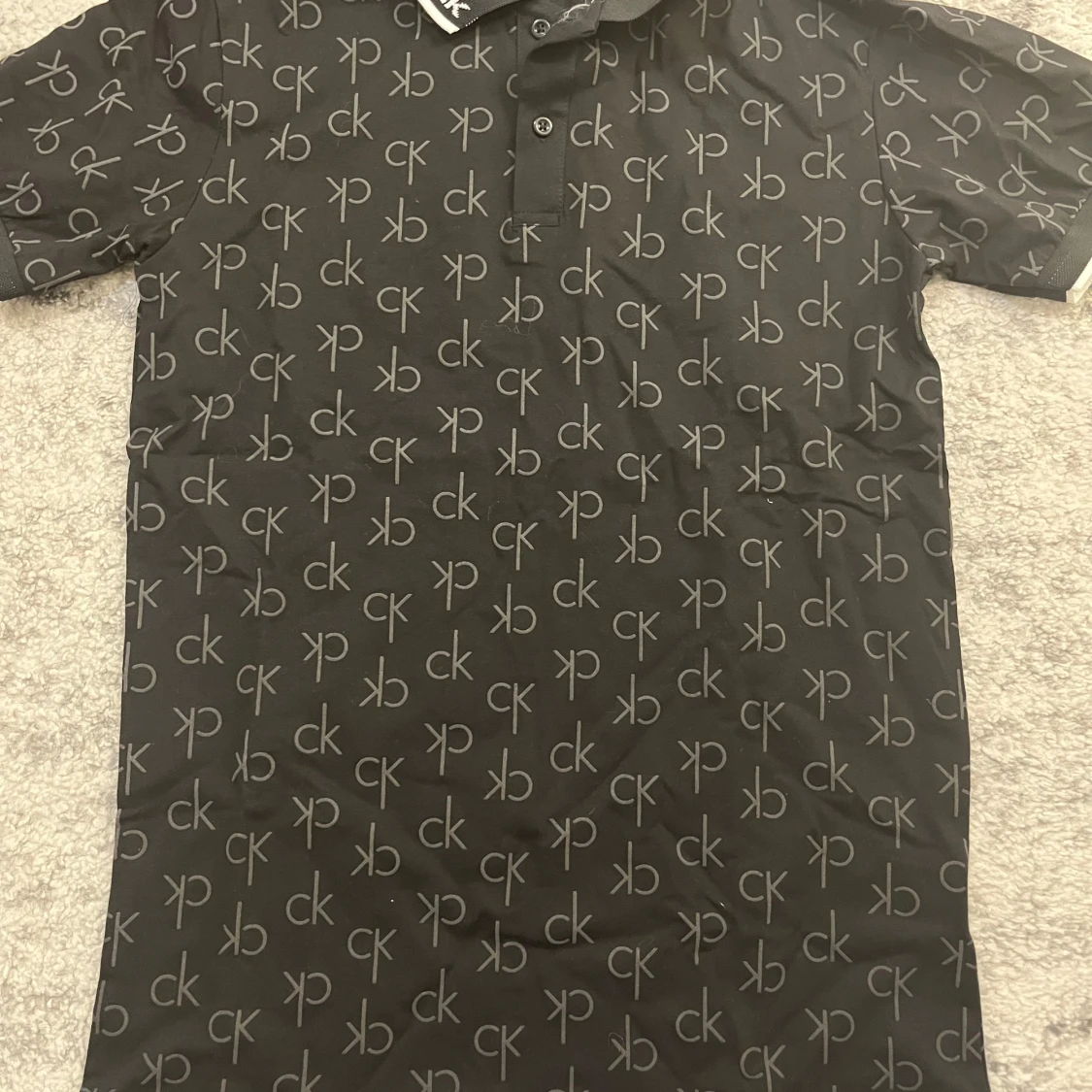 Snygg svart pikétröja från Calvin Klein med ett diskret mönster av CK-loggan över hela tyget. Tröjan har vita detaljer på kragen och ärmsluten, vilket ger en stilren kontrast. Perfekt för en avslappnad men ändå stilfull look. Passar m
