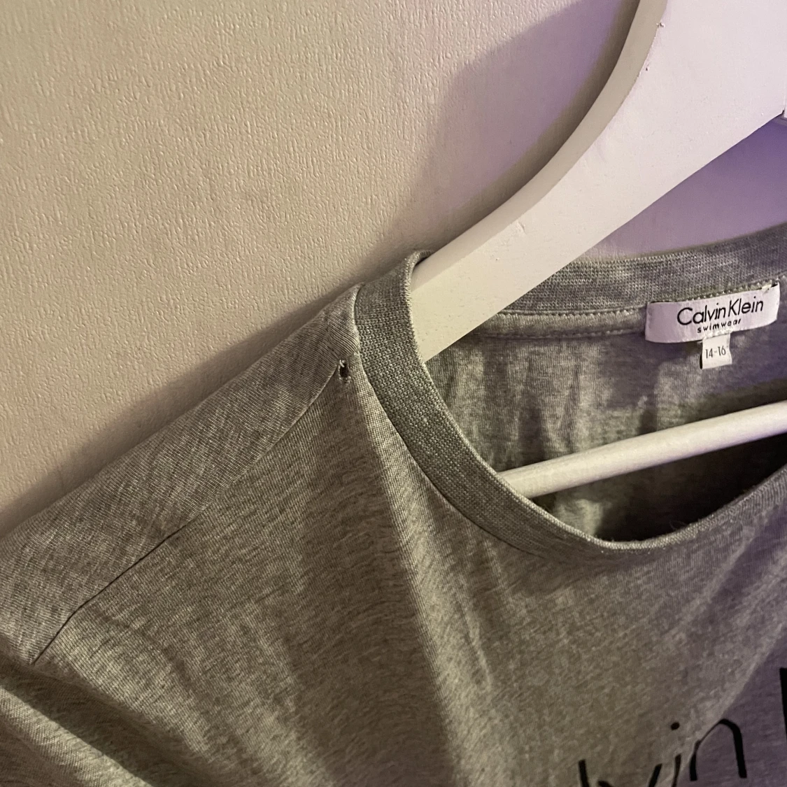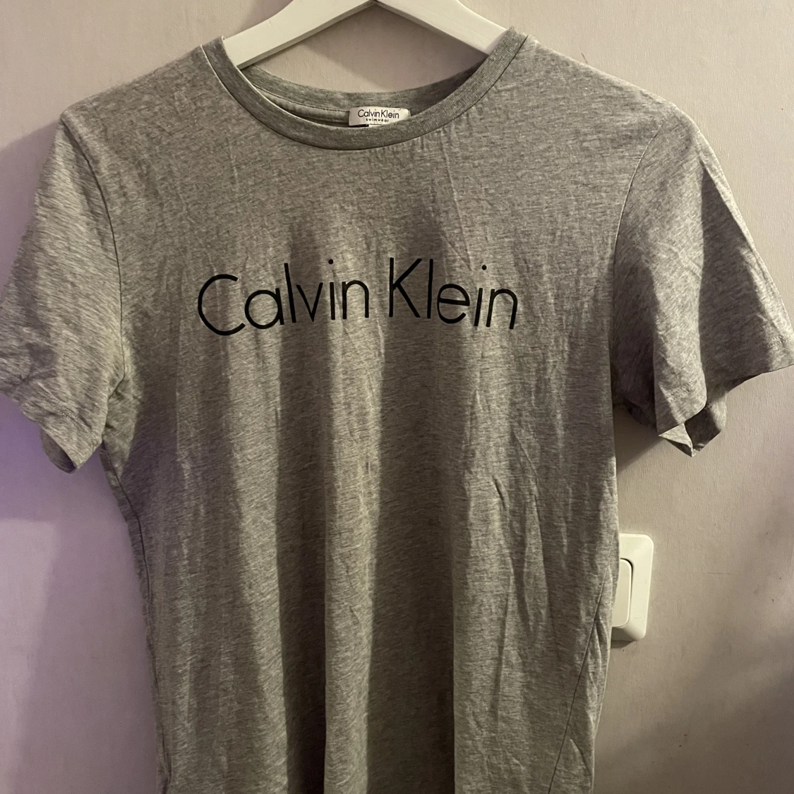 En grå Calvin Klein t-shirt med ett litet litet hål vid halsen. Storlek 14-16 men skulle säga M/S (bror på hur man vill att den ska sitta🥰)