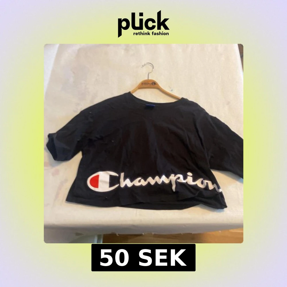 Säljer en svart croppad t-shirt från Champion med stort logotryck i vitt och rött på framsidan. Perfekt för en avslappnad stil. Observera att det finns ett litet hål på ena ärmen.