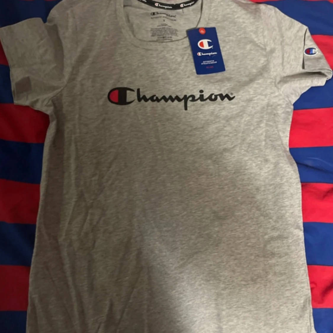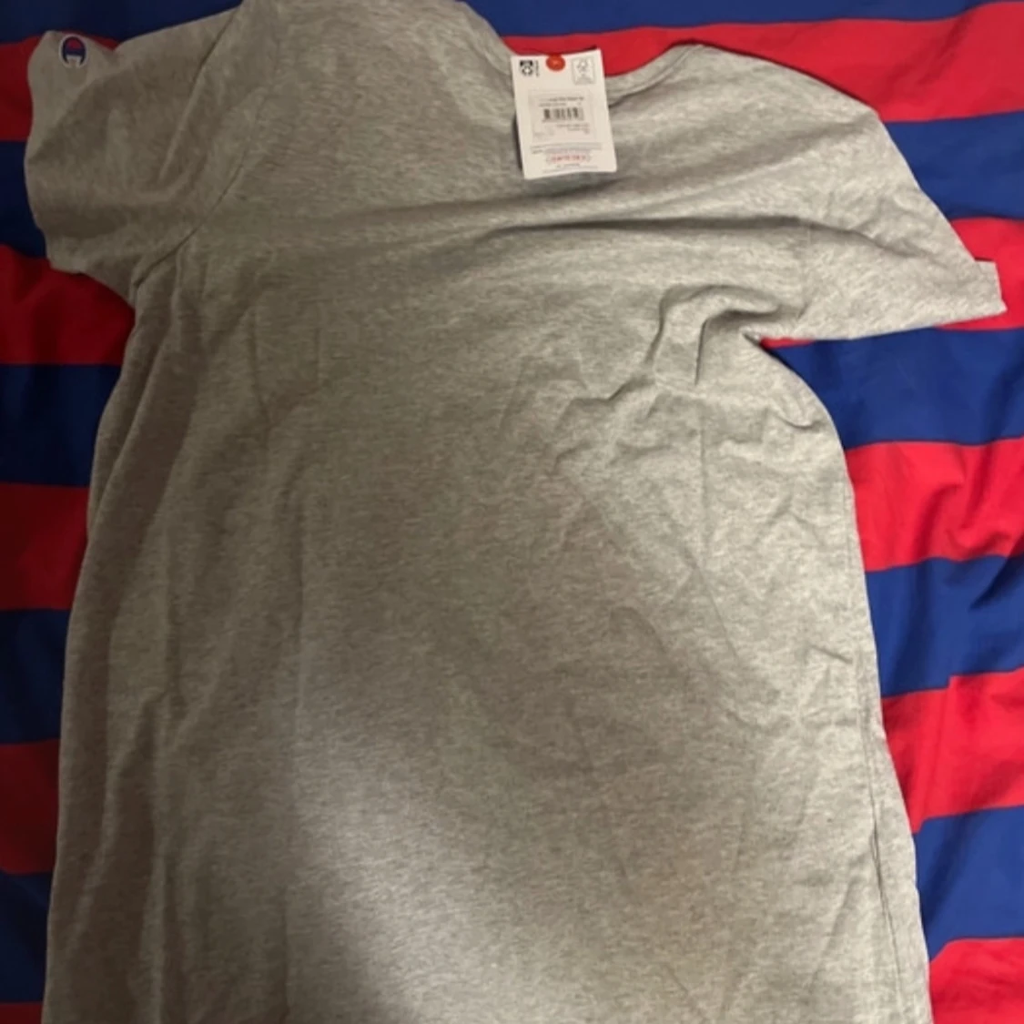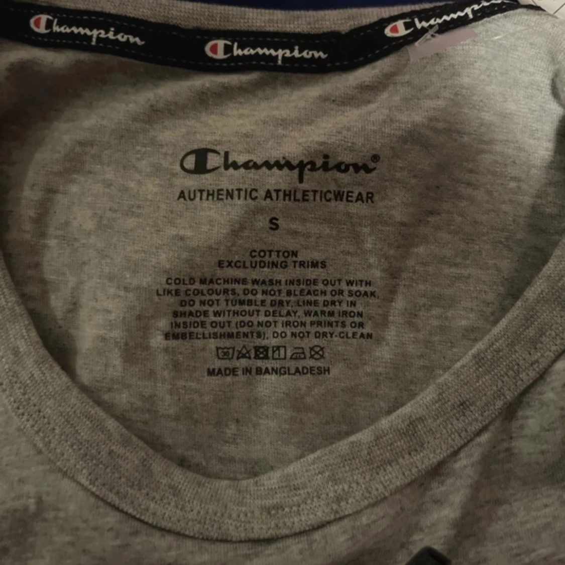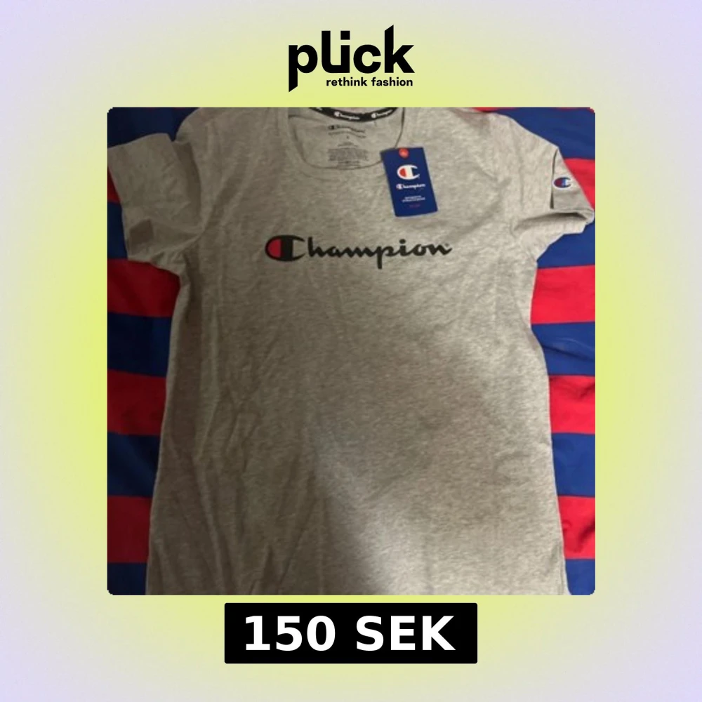 Säljer en grå t-shirt från Champion med deras ikoniska logga tryckt på bröstet. T-shirten är kortärmad och tillverkad i mjuk bomull, perfekt för en avslappnad stil. Oanvänd. Säljer pga aldrig använder den.