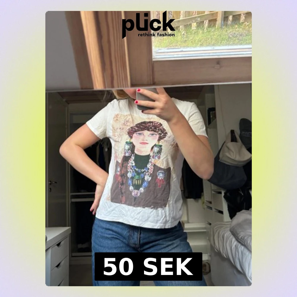 Vit t-shirt från Zara med ett konstnärligt tryck på framsidan som föreställer en person med detaljerade smycken och mönster. Rund hals och korta ärmar. Materialet är mjuk bomull och passformen är normal. Perfekt för dig som gillar unika prints!! Varan är använd men fortfarande bra skick