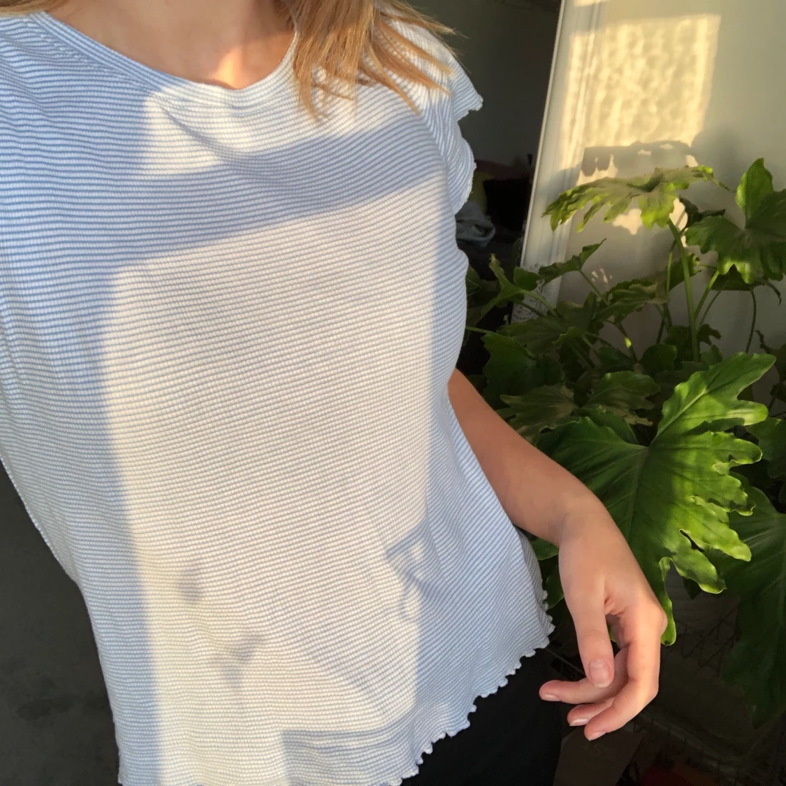 Supersöt vit & ljusblå t-shirt med ribbade kanter! från Cubus och är 146/152 i barnstorlek men passar mig som är S. Den är stretchig och skulle även kunna passa M. Andvänd bara ett fåtal gånger. Nypris ca 199kr. Går att vika under vid kanten så den ser croppad ut.