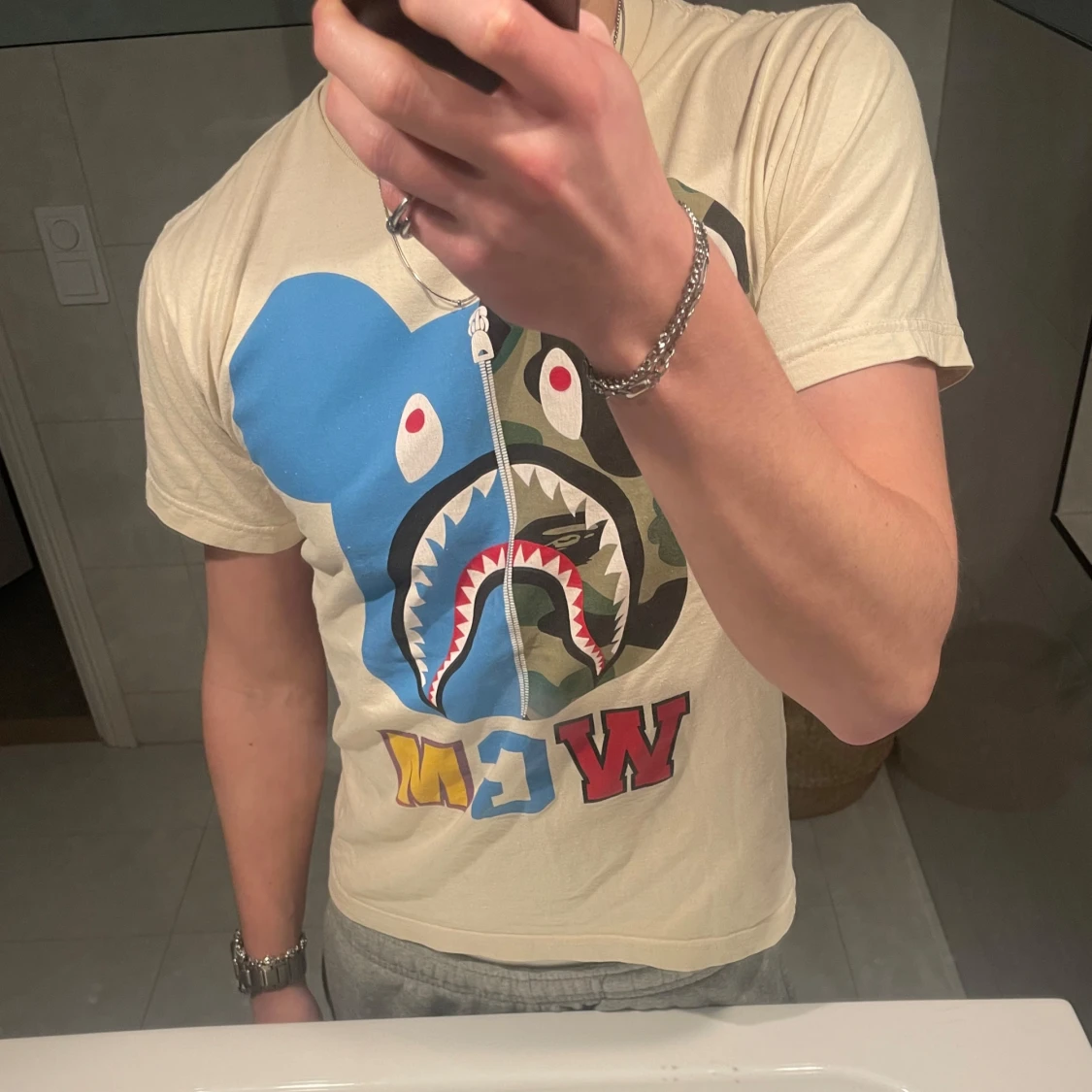 Säljer en äkta BAPE med ett fett tryck av en björn i blått och camouflage. Super najs fit och kvalitet, lutar mer åt en XS. Passar dig som är mellan 170 upp till 179 bäst. Pris är inge hugget i sten vid snabb affär! Inga defekter alls!