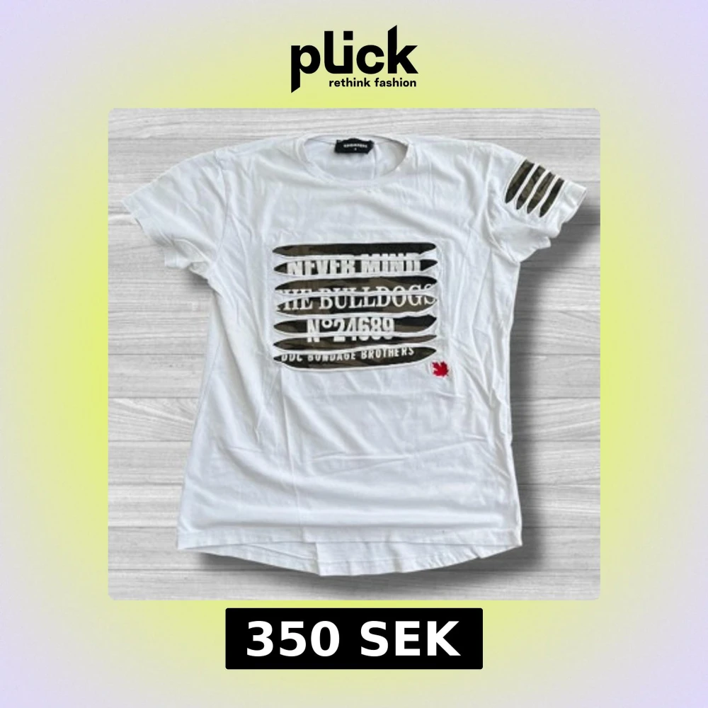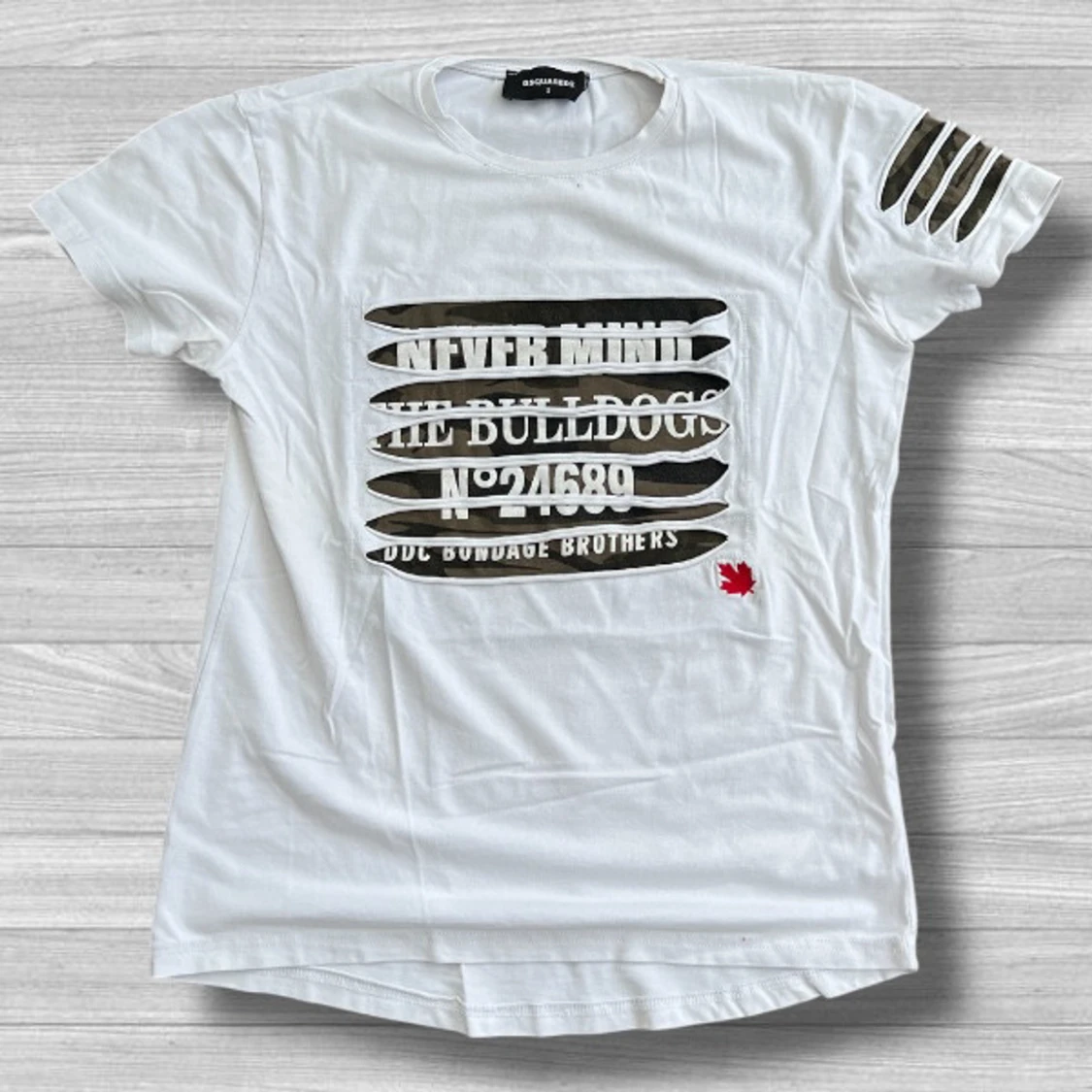 Cool vit t-shirt från Dsquared2 i bomull med unika slitsar både på bröstet och ena ärmen. Tryck med texten 'Never Mind The Bulldogs' och en liten röd lönnlöv-detalj. Passformen är normal och t-shirten har rund hals och korta ärmar.