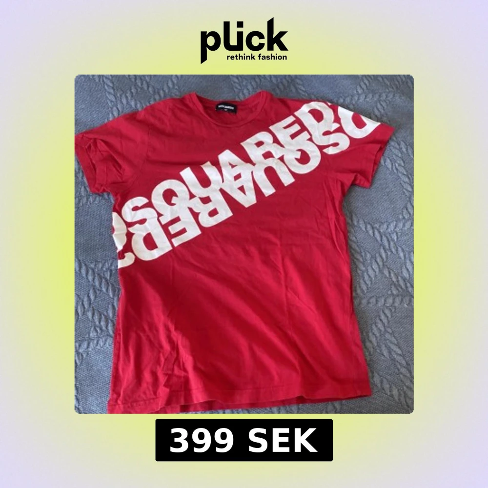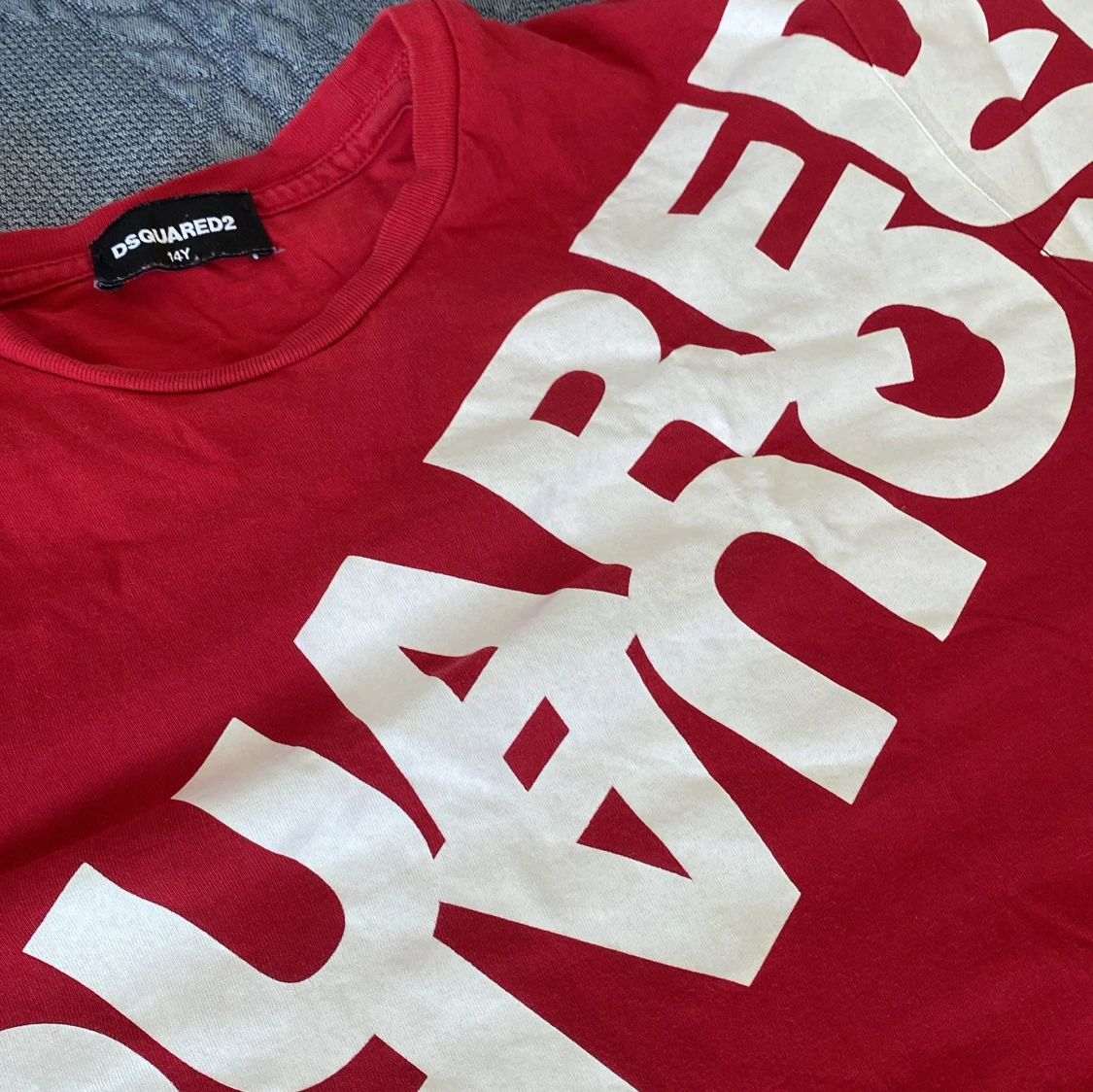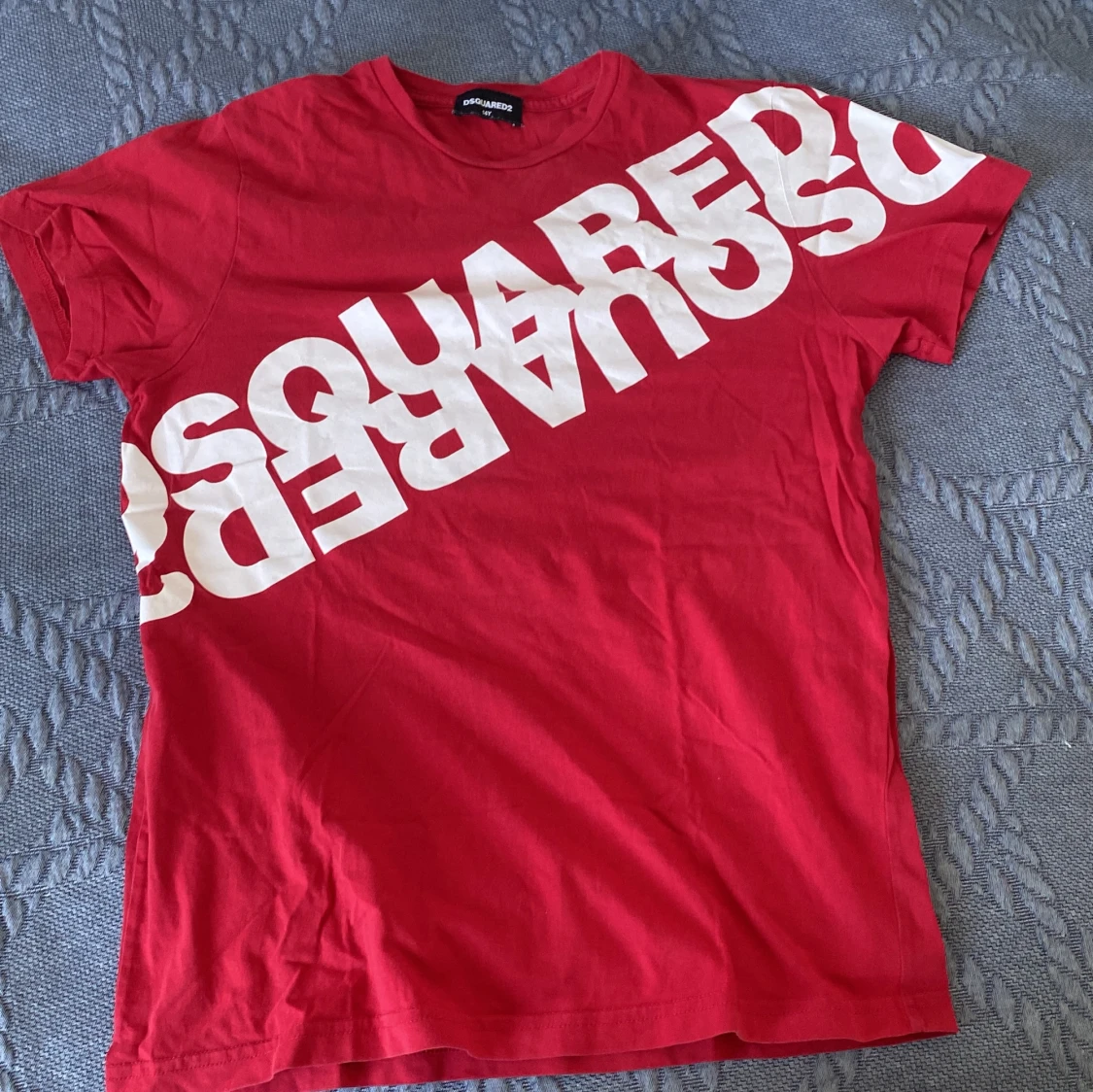 Röd t-shirt från DSquared2 med stort vitt logotyp-tryck diagonalt över framsidan. Den är lite använd men är i bra skick. Hör av vid funderingar!