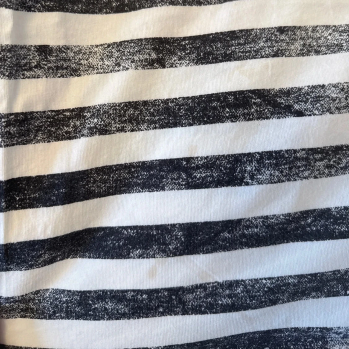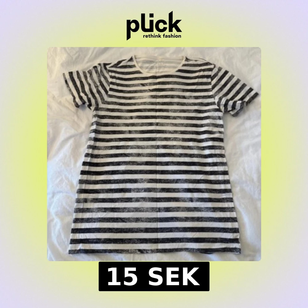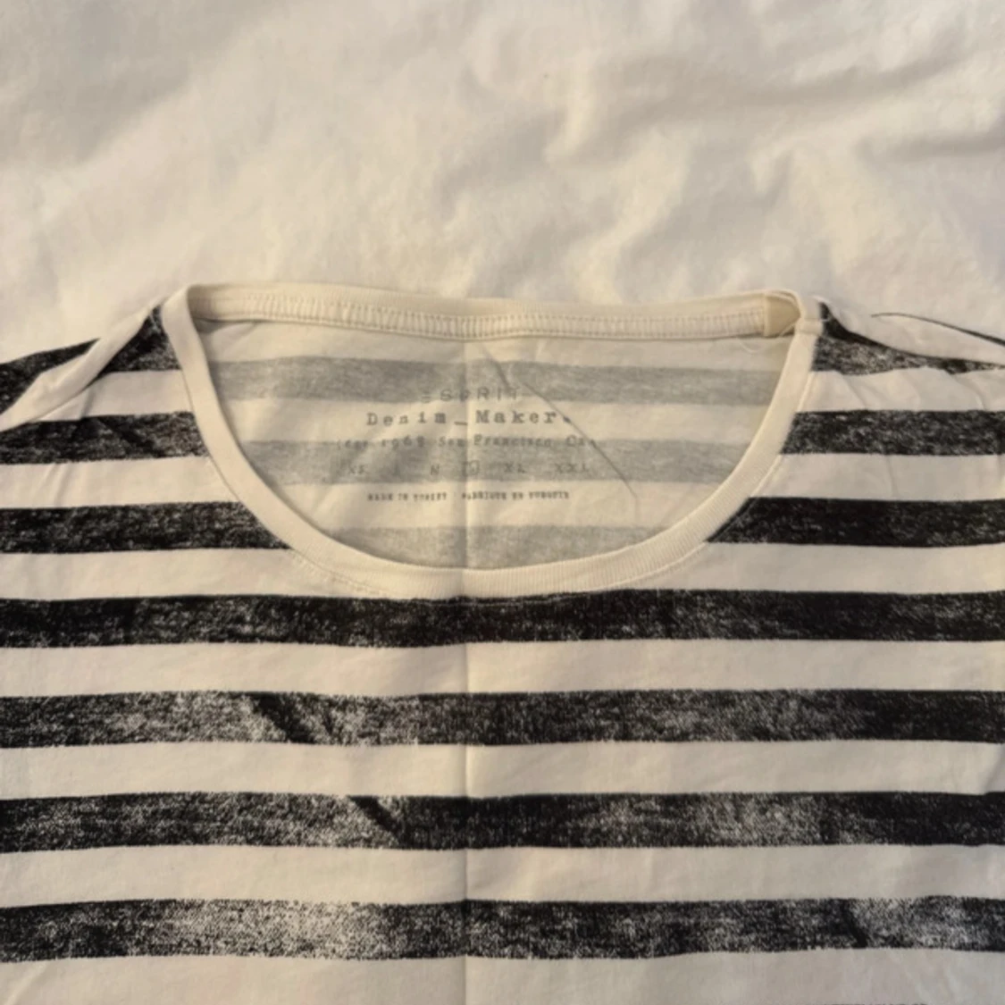 Snygg svartvit t-shirt med horisontella ränder i en lite sliten look. Klassisk rund hals och korta ärmar. Materialet är mjuk bomull som känns skönt mot huden. Perfekt för dig som gillar en enkel men cool stil.