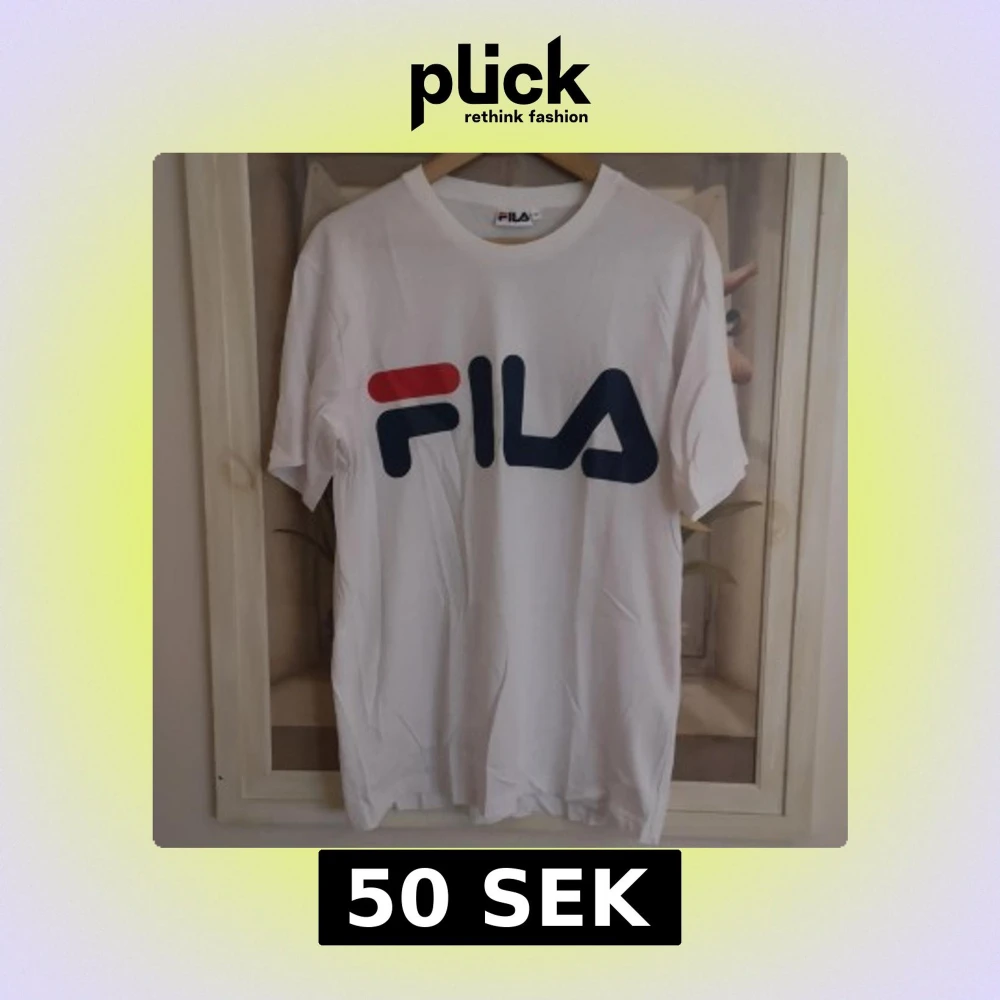 Säljer en klassisk vit t-shirt från FILA med stor logga i blått och rött på framsidan. T-shirten har korta ärmar och rund halsringning.