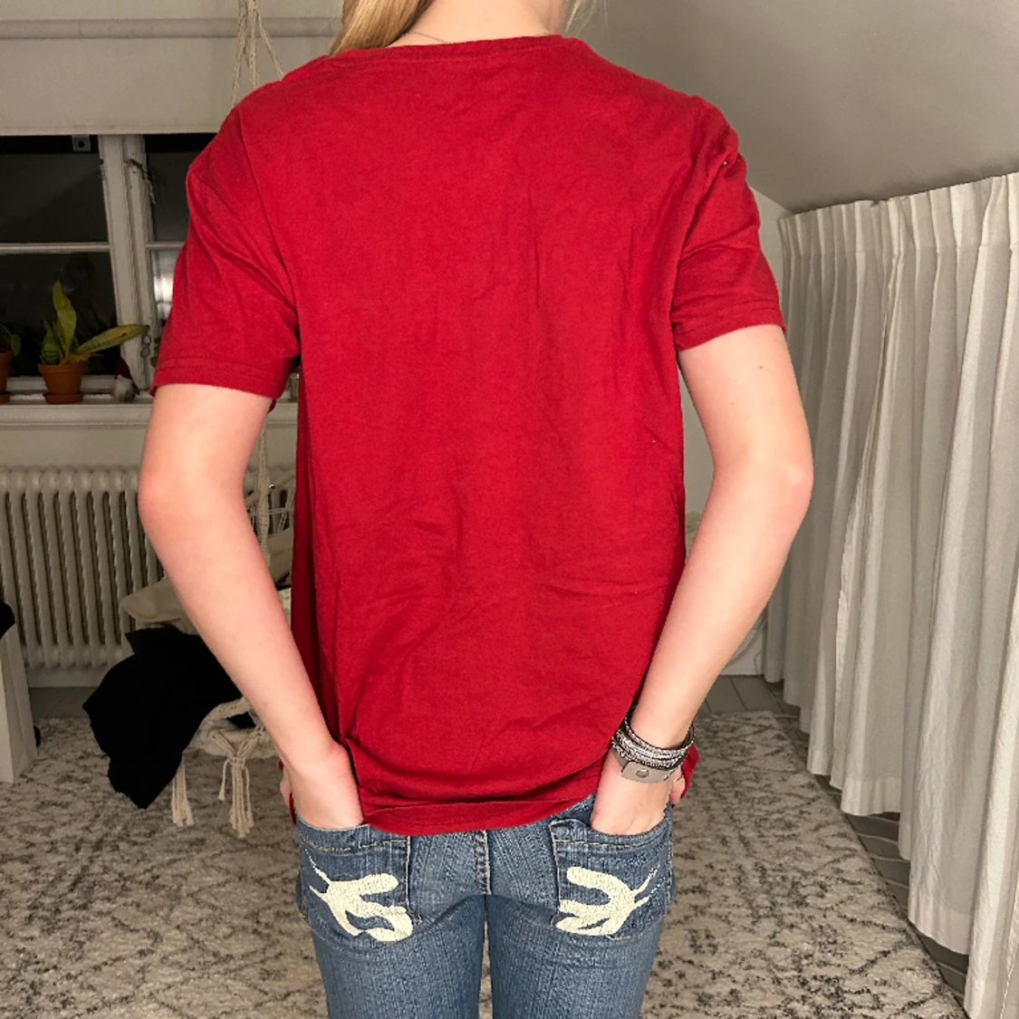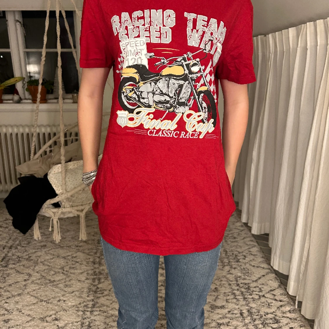 Cool röd tröja med motorcykel tryck på. Fräckt.