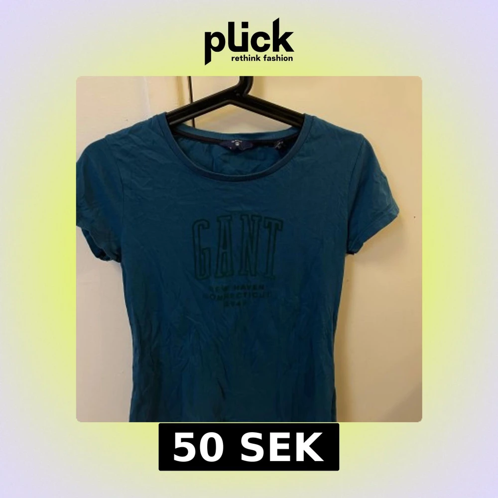 Säljer en blå t-shirt från GANT med tryck 'GANT New Haven Connecticut 1949' på bröstet. T-shirten har rund halsringning och korta ärmar. Perfekt för en avslappnad och stilren look.