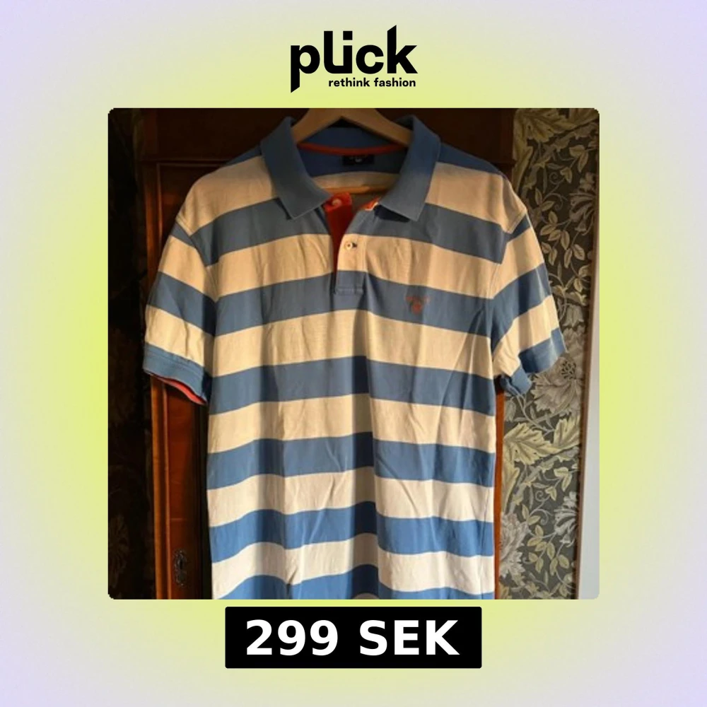 Snygg pikétröja från Gant med breda blå och vita ränder, klassisk krage och korta ärmar. Broderad logga på bröstet och orange detalj på insidan av knäppningen. Perfekt för en sportig och avslappnad stil.