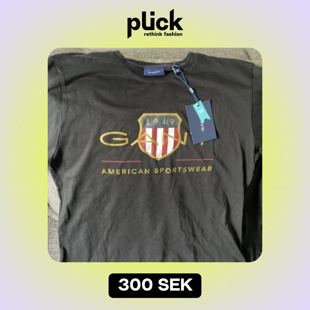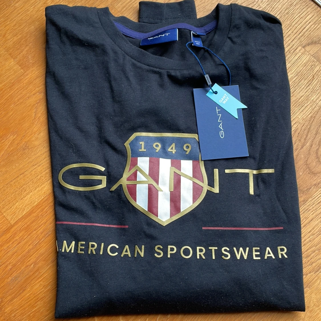 Säljer en snygg svart t-shirt från GANT med tryck av deras klassiska logga och texten 'American Sportswear'. T-shirten är i nyskick och har en normal passform. Perfekt för en casual look!avser tonåring stl S