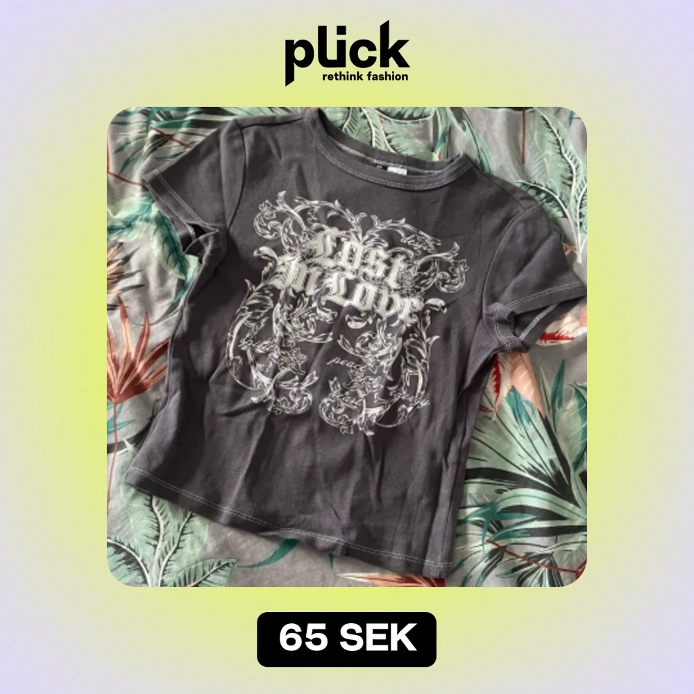 En grå lite croppad tshirt från Hm. Köptes förra sommaren och användes endast ca tre gånger så i jättefint skick. Inga bristningar i trycket heller. Det är rätt så stretchig även om den ska sitta lite tightare skulle jag säga. 🫶🏼