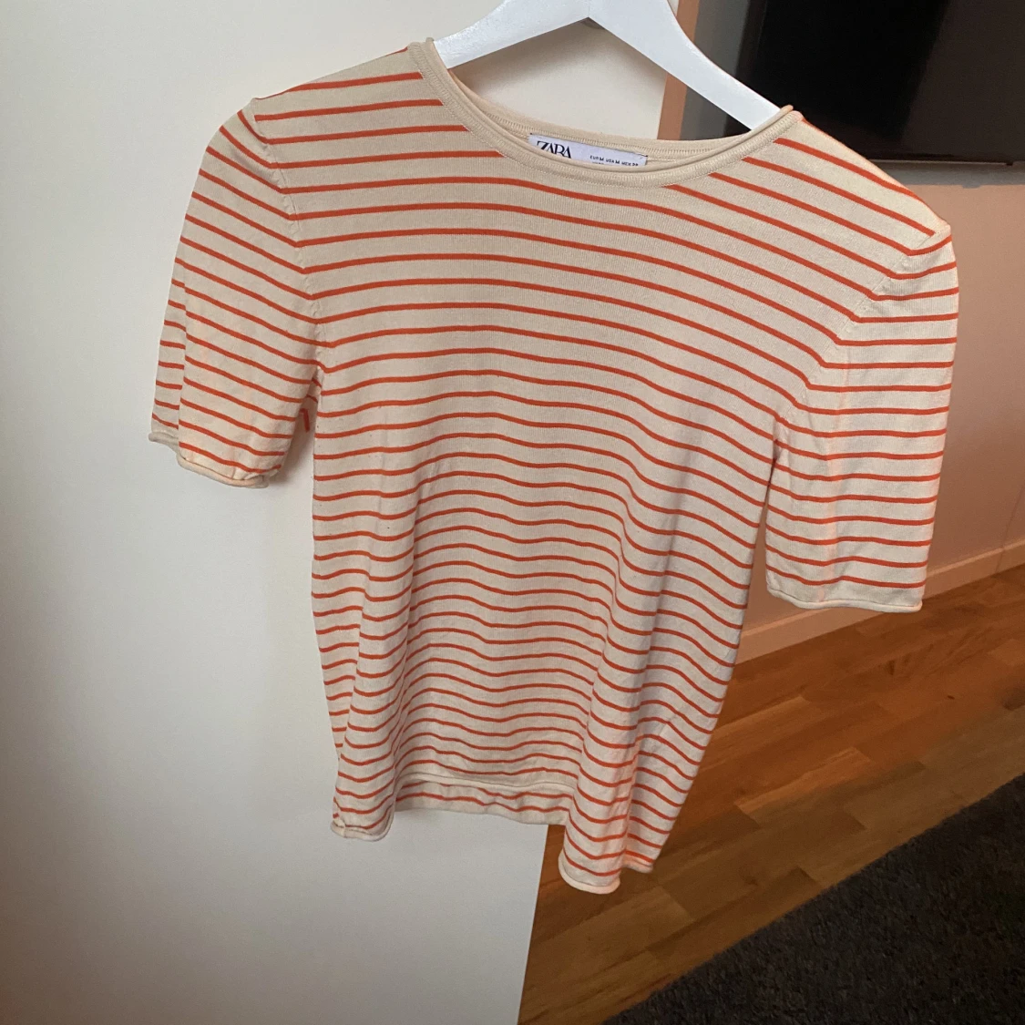 Gräddvit/Orange randig t-shirts från Zara. Använd fåtal gånger. Liten i storleken!