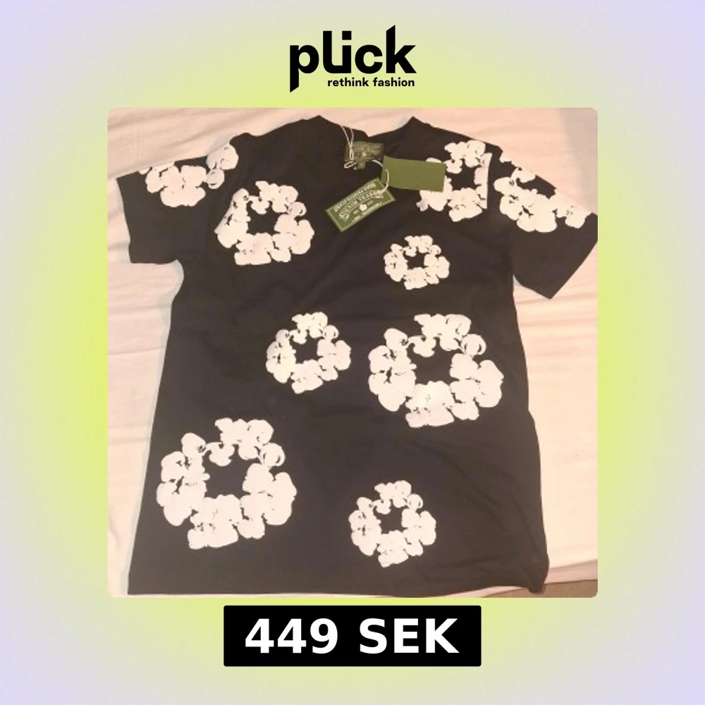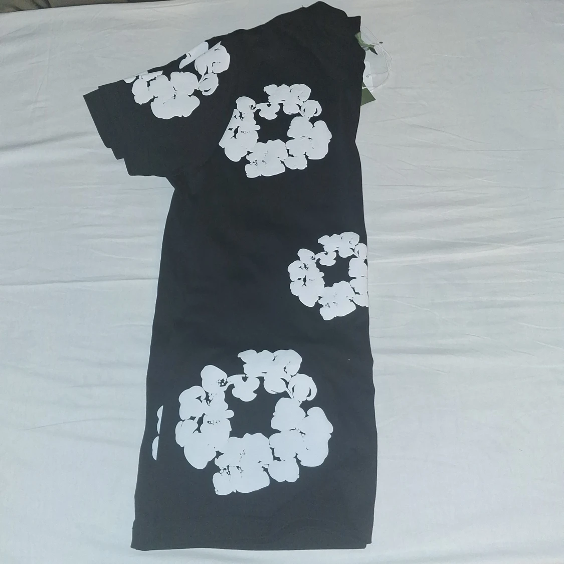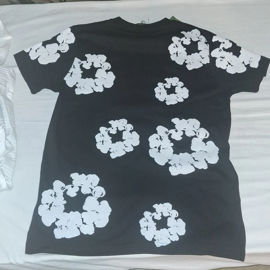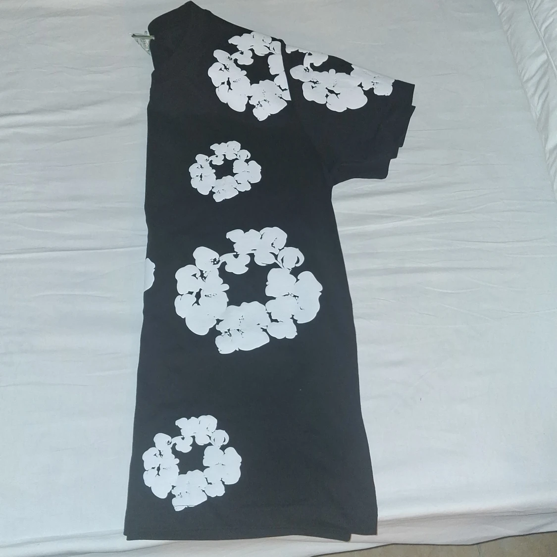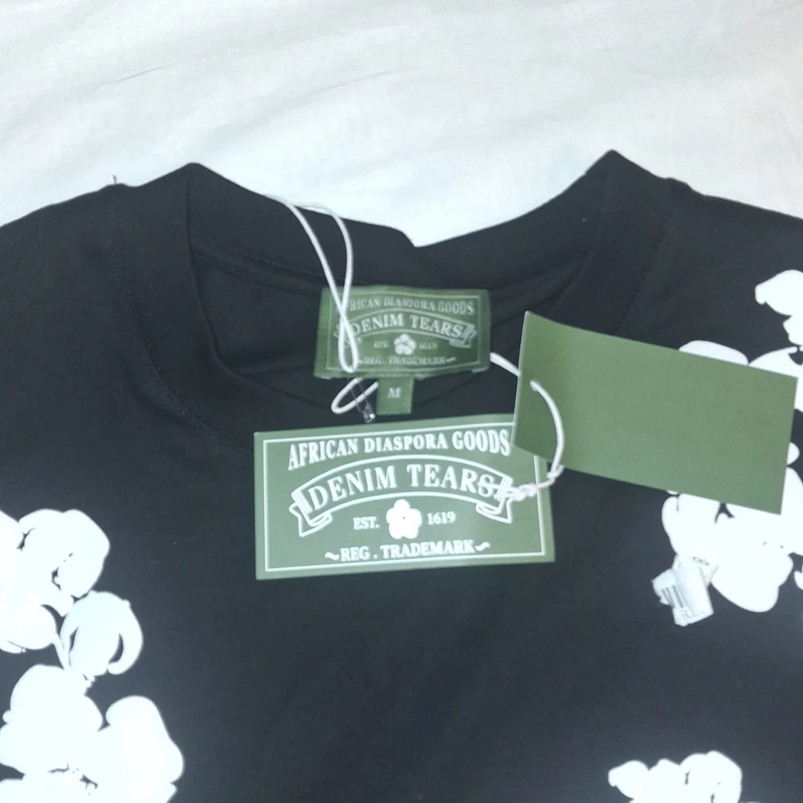 Svart t-shirt från Denim Tears med stora vita blommiga tryck över hela plagget. Klassisk passform med rund hals och korta ärmar. Materialet är mjuk bomull som känns skönt mot huden. Perfekt statement-piece för dig som vill sticka ut.