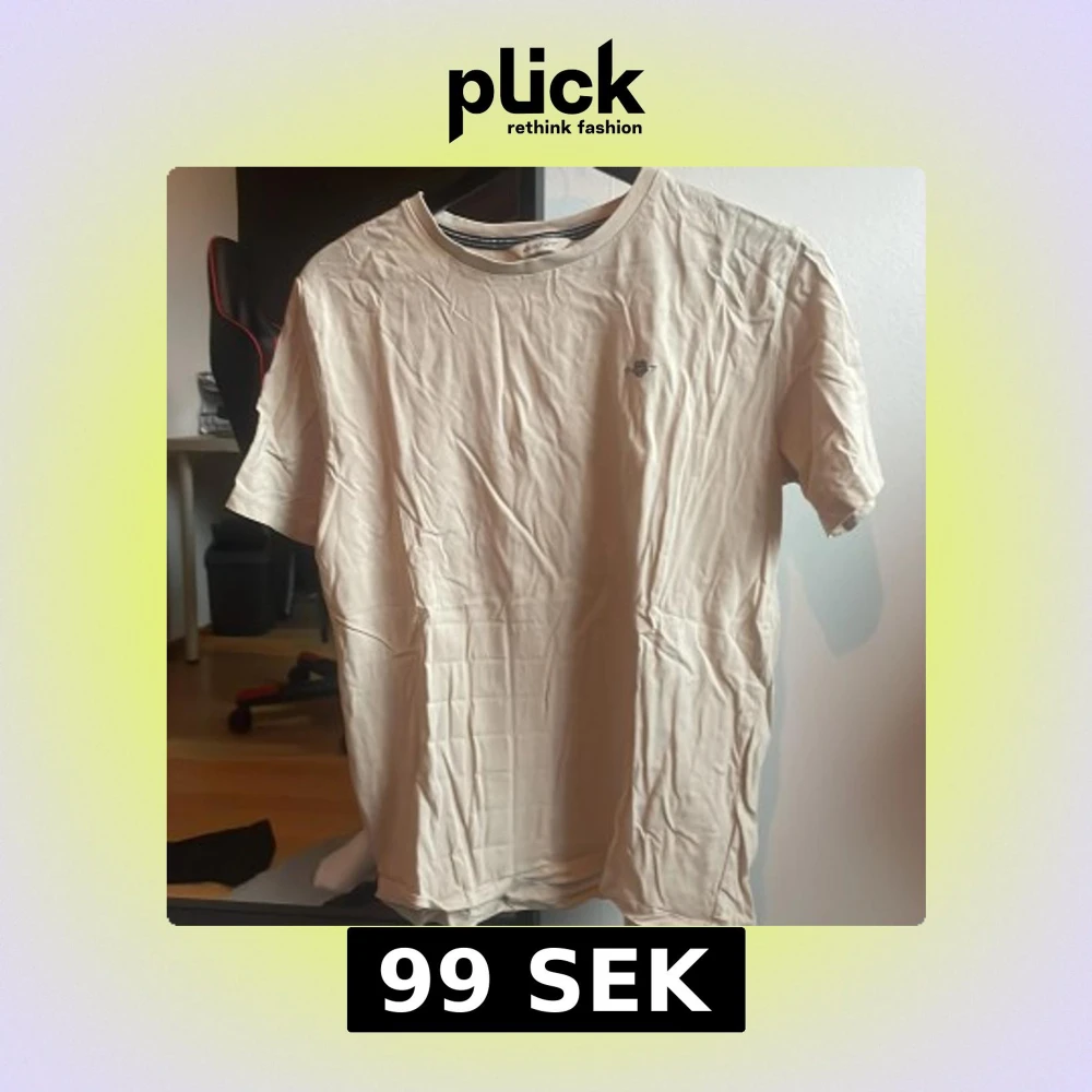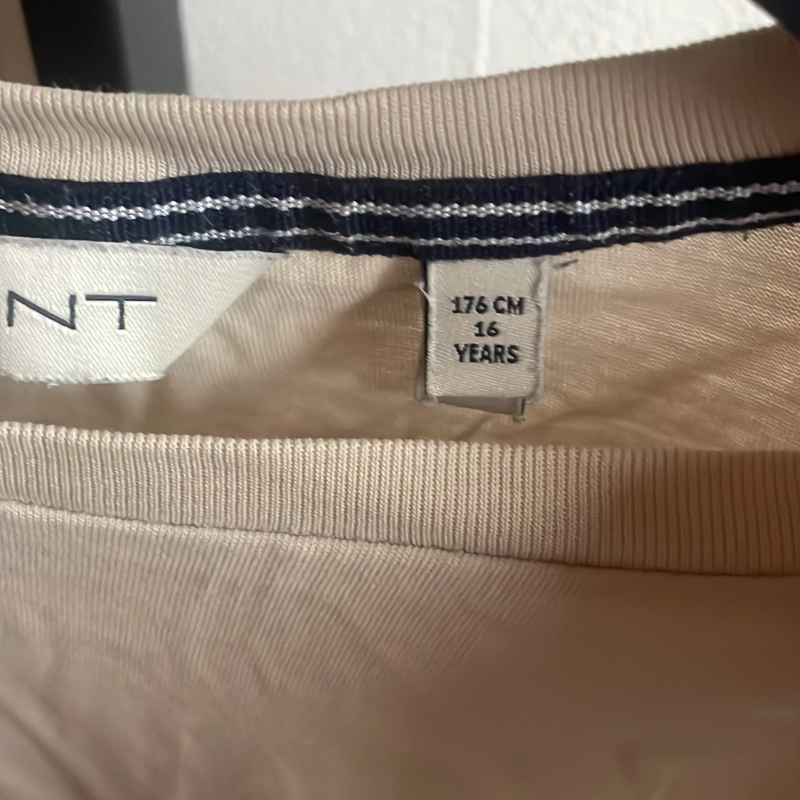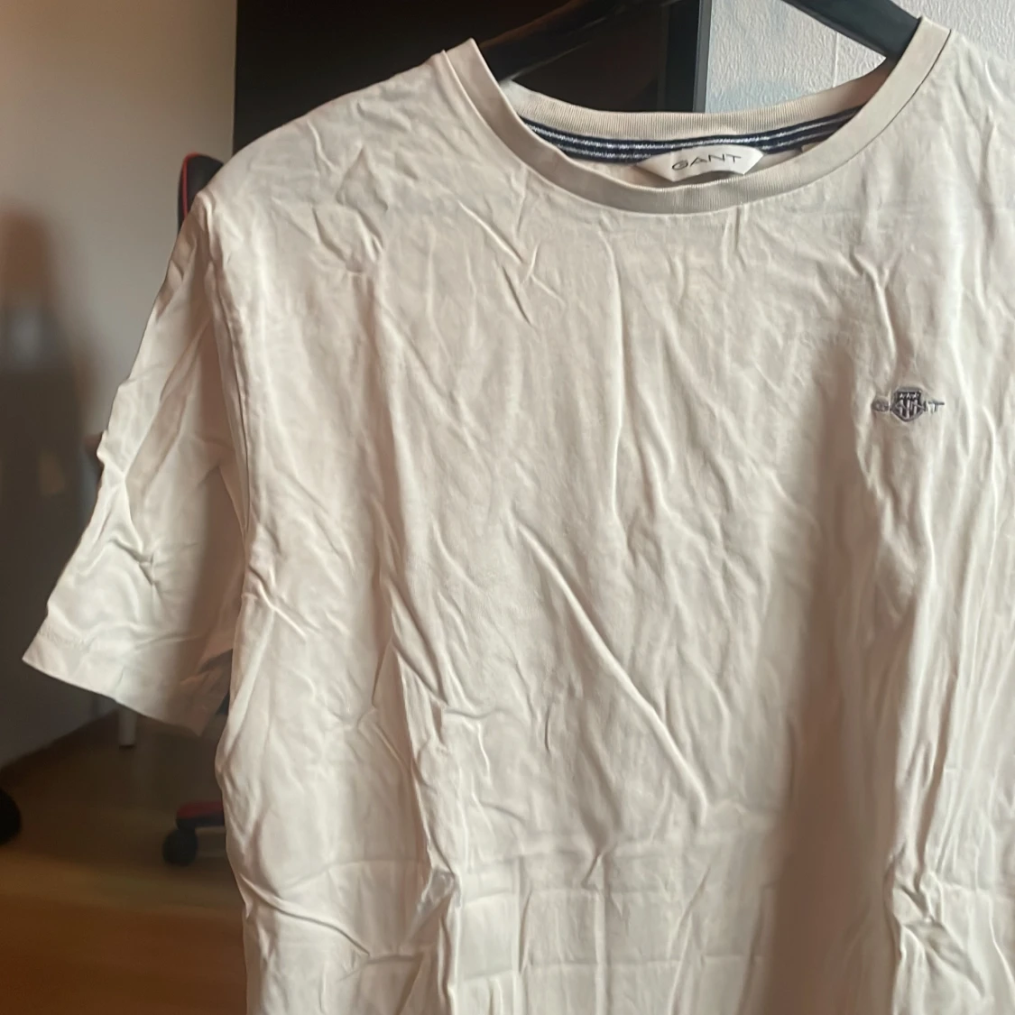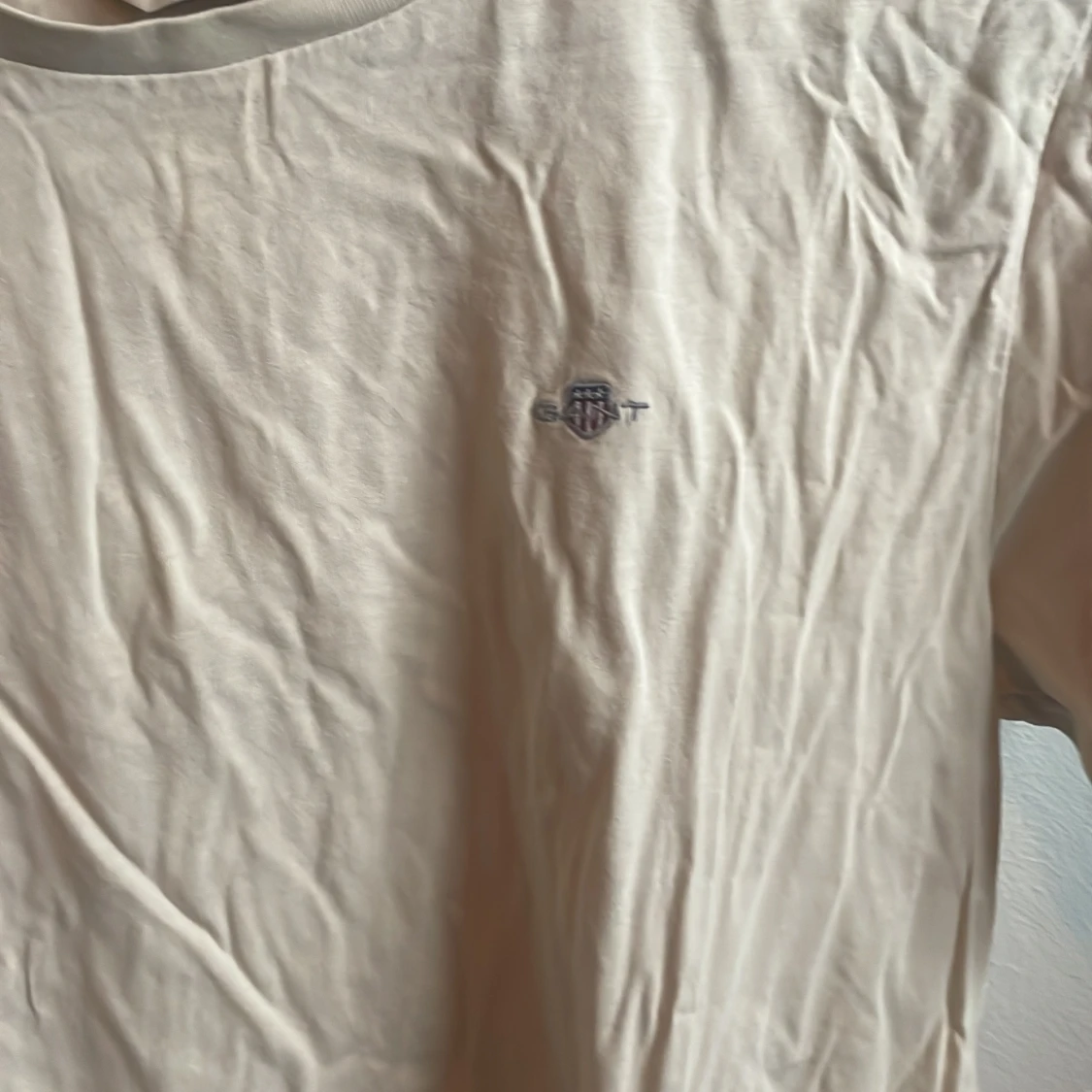 Snygg beige t-shirt från Gant med liten broderad logga på bröstet. Klassisk rund halsringning och korta ärmar. Tillverkad i mjuk bomull som känns skön mot huden. Perfekt för en clean och stilren look. Kontakta mig om ni har några funderingar!
