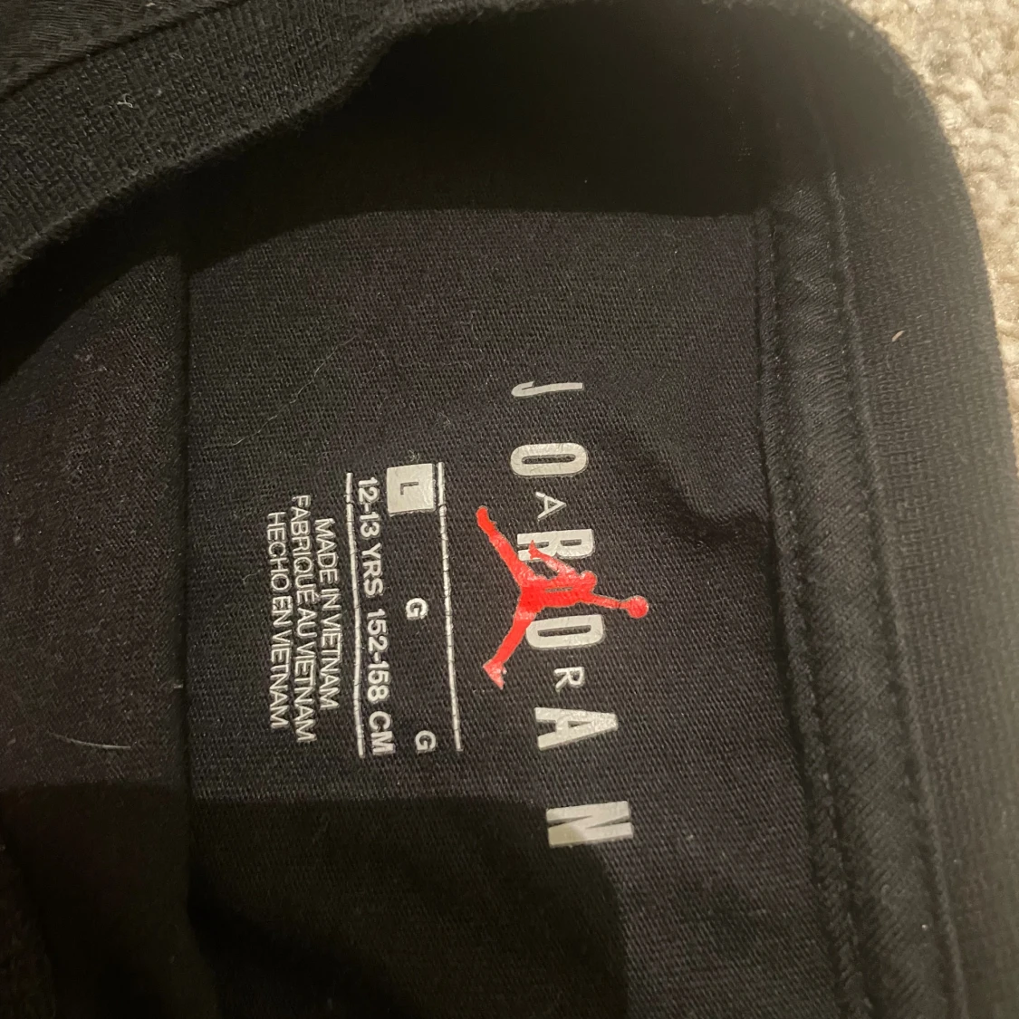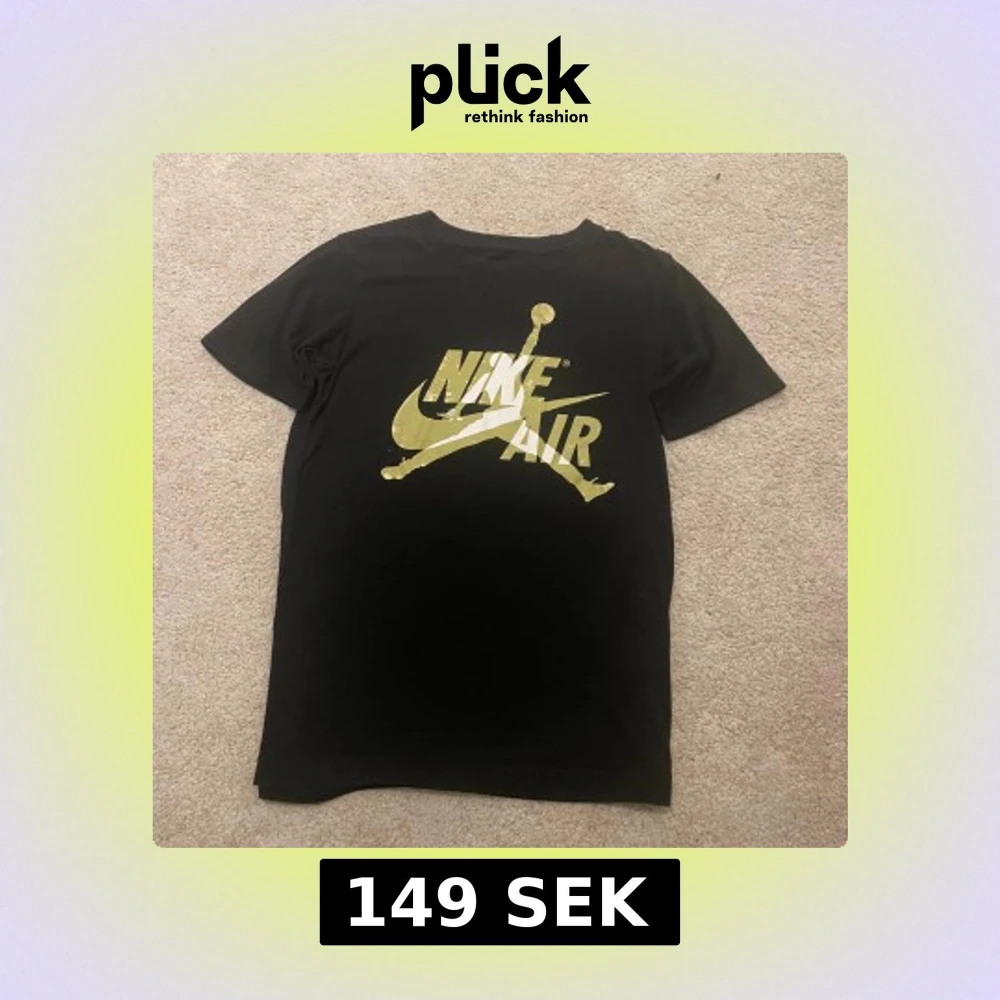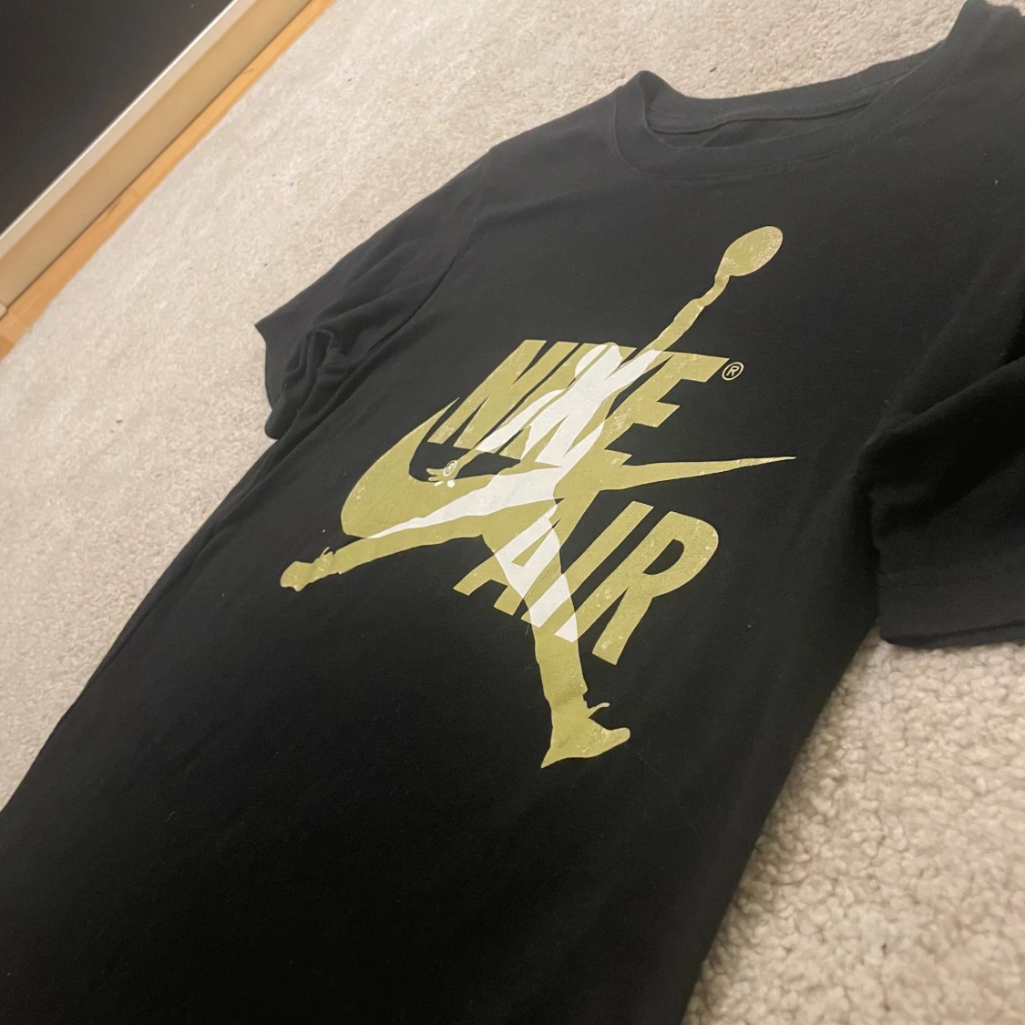 Svart t-shirt från Jordan med stort guldigt Nike Air-tryck och Jumpman-logga på bröstet. Klassisk rund hals och korta ärmar. Tillverkad i mjuk bomullsblandning för skön passform. Perfekt för dig som gillar sportig streetstyle.