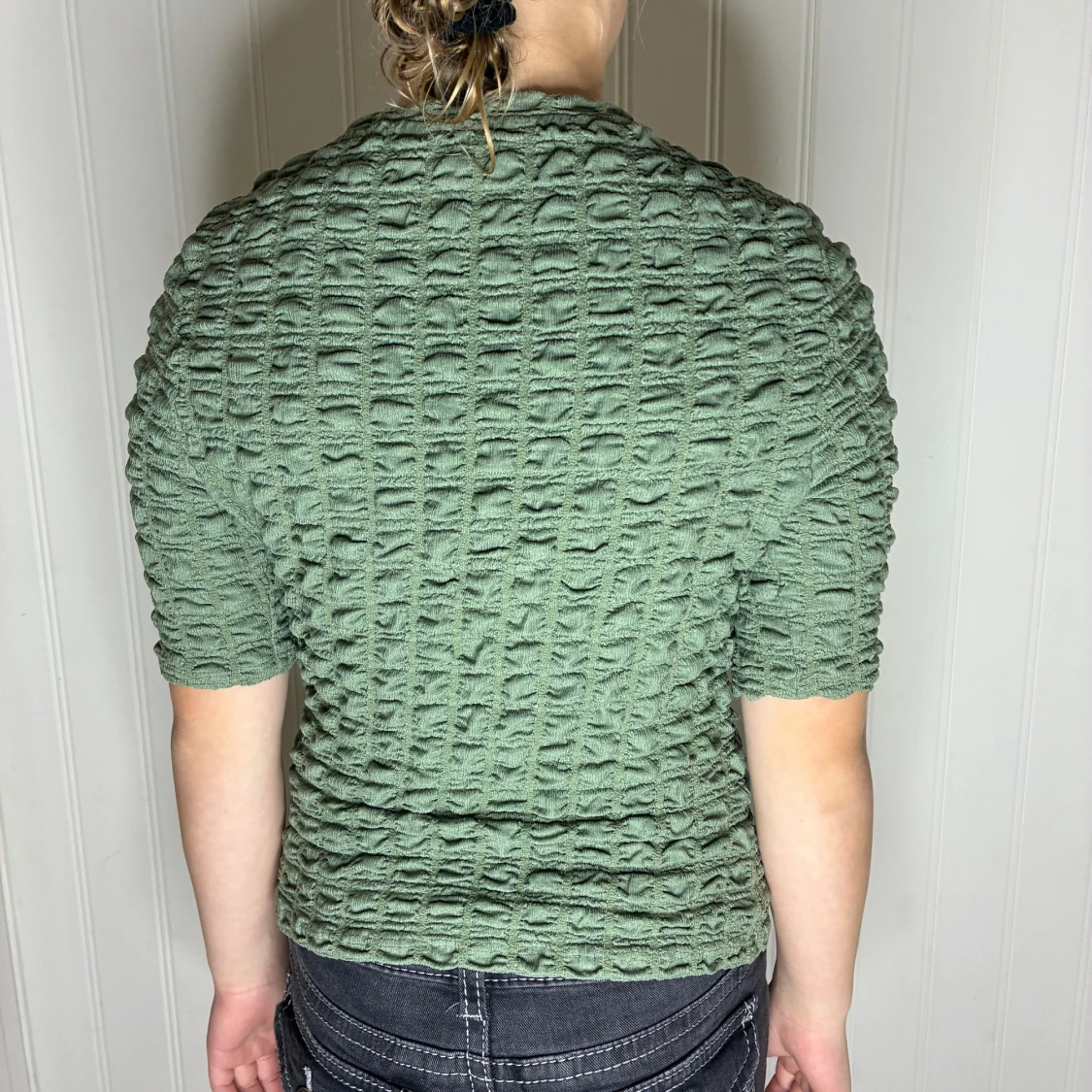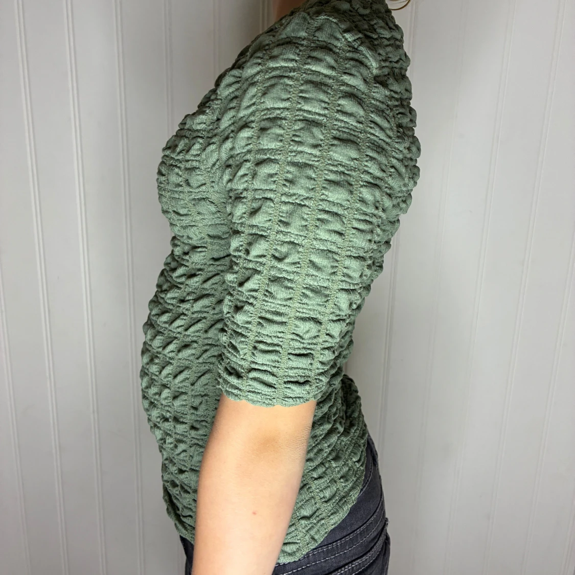 Säljer en grön topp från Lindex i storlek XS. Toppen har ett unikt ribbat och strukturerat mönster, rund hals och halvlånga ärmar. Säljer på grund av att den är för liten. Pris kan diskuteras❤️