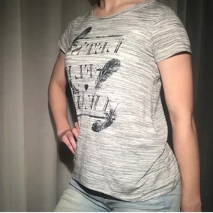 Ljusgrå t-shirt med tryck. Snygg om man vill ha något basic men ändå med en speciell touch. Använd men tvättad och inga defekter. Färgen på första två bilderna stämmer bäst:) Säljer pga lite för liten för mig. Frakt tillkommer. Jag garanterar en snabb och pålitlig affär! Sampackar gärna om du köper något mer🥰