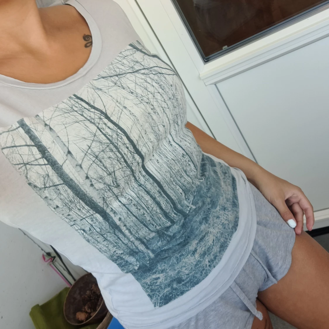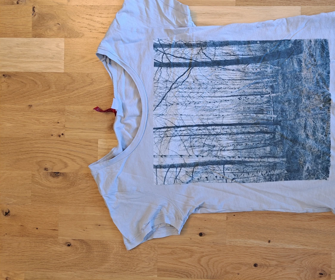 Superskön t-shirt i grå/blåa nyanser med tryck. Har två pyttesmå hål vid sidan, men syns knappt