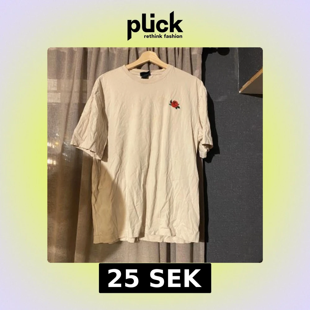 Beige t-shirt från H&M i relaxed fit med broderad röd ros på bröstet. Klassisk rund halsringning och korta ärmar. Tillverkad i mjuk bomull, perfekt för en chill och stilren look. Har en fett fläck bredvid rosen och vet ej hur man får bort den
