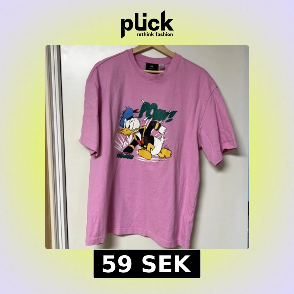 Säljer en cool rosa t-shirt från H&M med ett färgglatt Kalle Anka-tryck och texten 'Pow!'. Perfekt för dig som gillar serietidningar och vill ha en unik stil. T-shirten är kortärmad och gjord i mjukt bomullsmaterial.