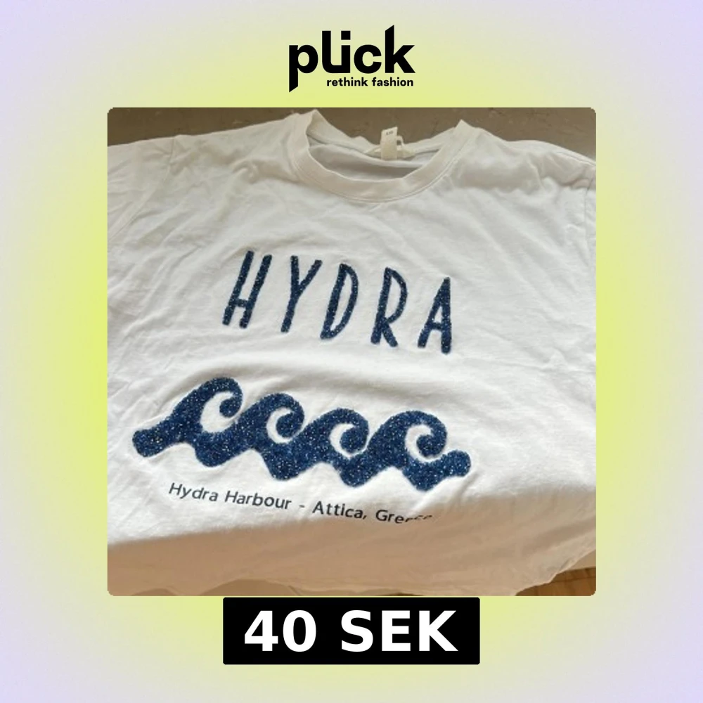 Vit t-shirt från H&M med trycket HYDRA i blått glitter och glittrande vågor under. Rund halsringning och klassisk passform. Materialet är mjuk bomull och t-shirten har korta ärmar. Perfekt för dig som gillar unika prints och somriga vibbar.